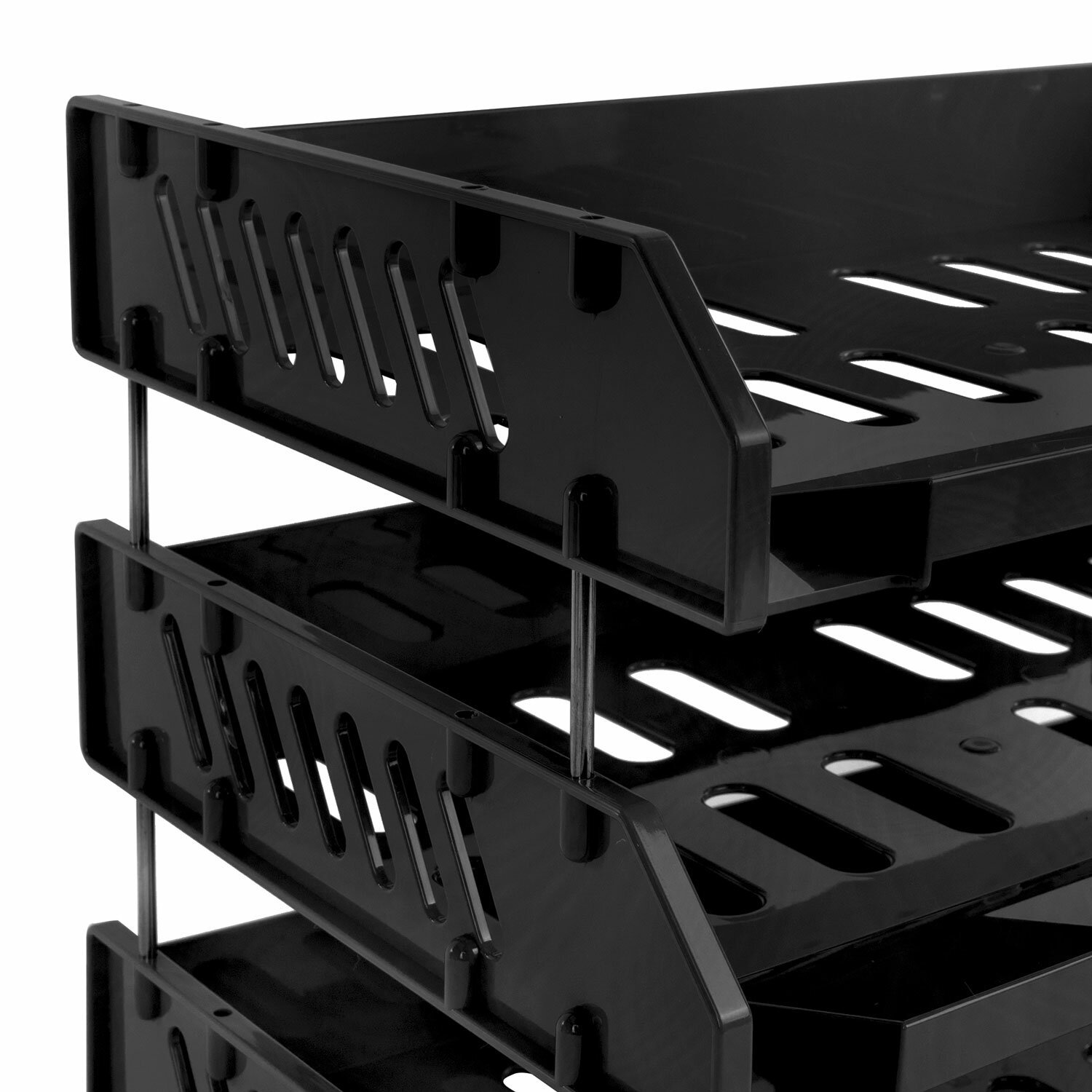 Изготовлены из прочного полистирола. Размер лотков в собранном виде - 335х232х246 мм. Комплект из 3 лотков обладает устойчивой конструкцией, благодаря которой удобен для хранения объемных документов и папок. Выполнены в черном цвете.