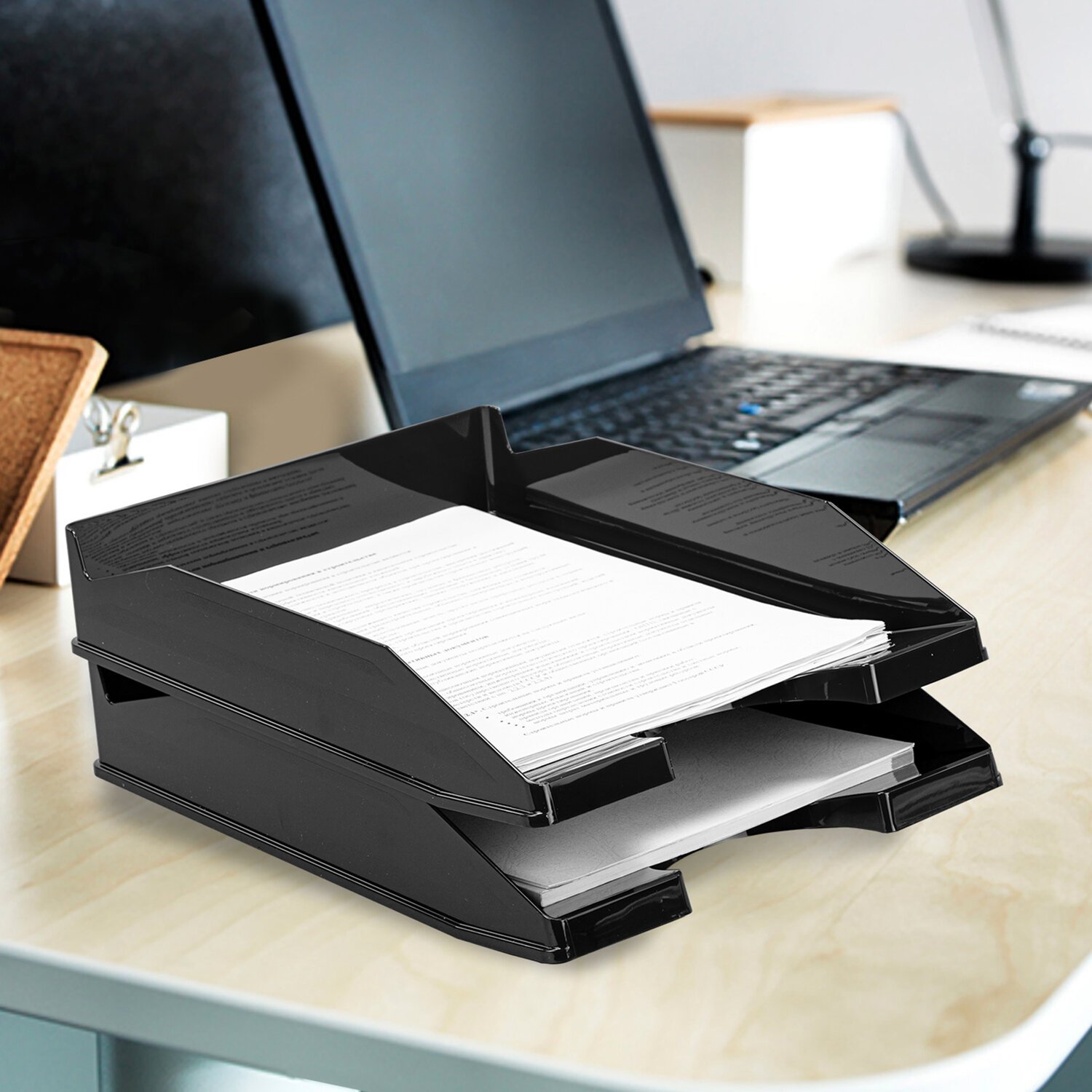 Изготовлены из прочного полистирола. Размер каждого лотка (ГхШхВ) - 346х254х61 мм. Комплект из 2 лотков обладает устойчивой конструкцией, благодаря которой удобен для хранения объемных документов и папок. Выполнен в черном цвете. Лотки могут быть установлены друг на друга или использоваться по отдельности.
