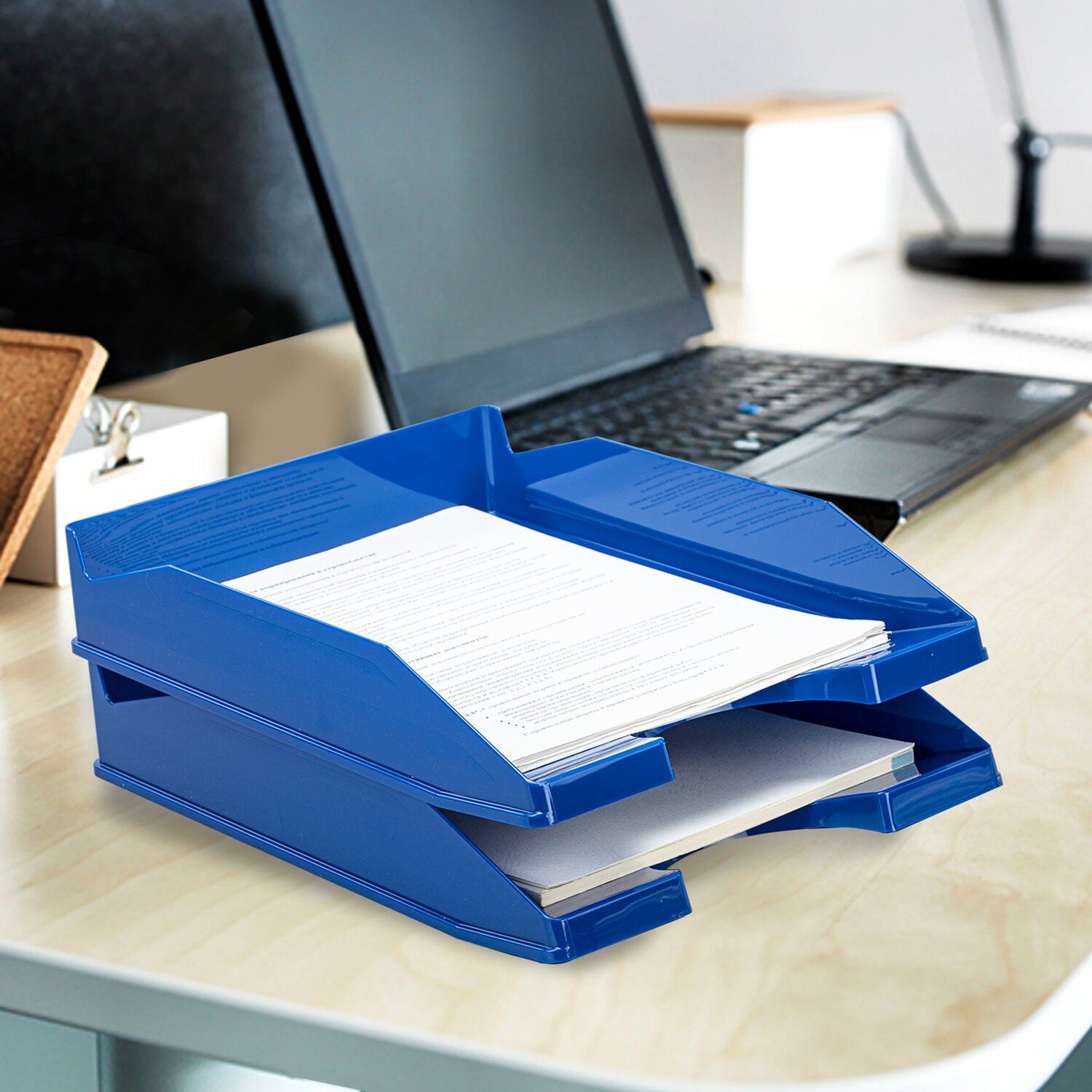 Изготовлены из прочного полистирола. Размер каждого лотка (ГхШхВ) - 346х254х61 мм. Комплект из 2 лотков обладает устойчивой конструкцией, благодаря которой удобен для хранения объемных документов и папок. Выполнен в синем цвете. Лотки могут быть установлены друг на друга или использоваться по отдельности.