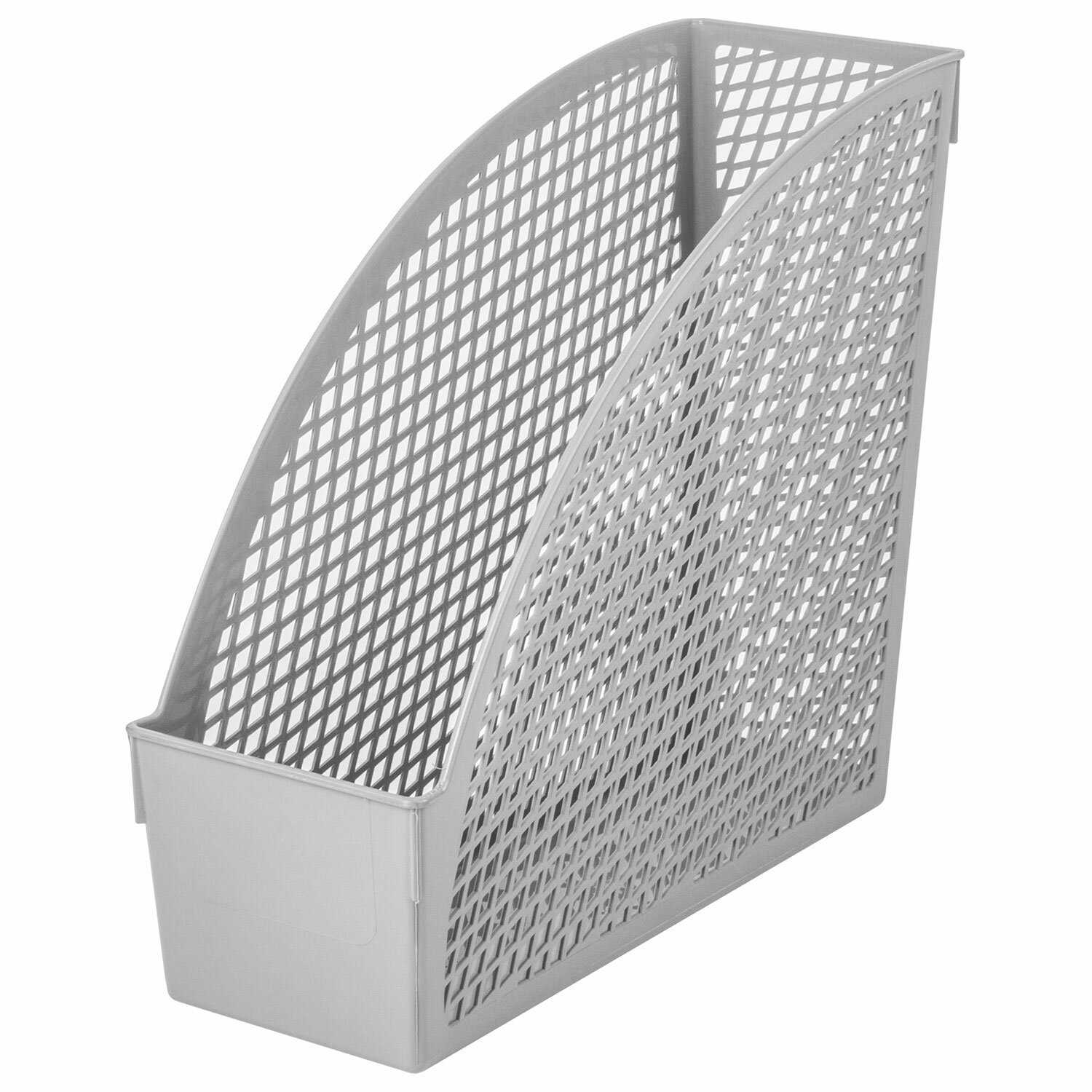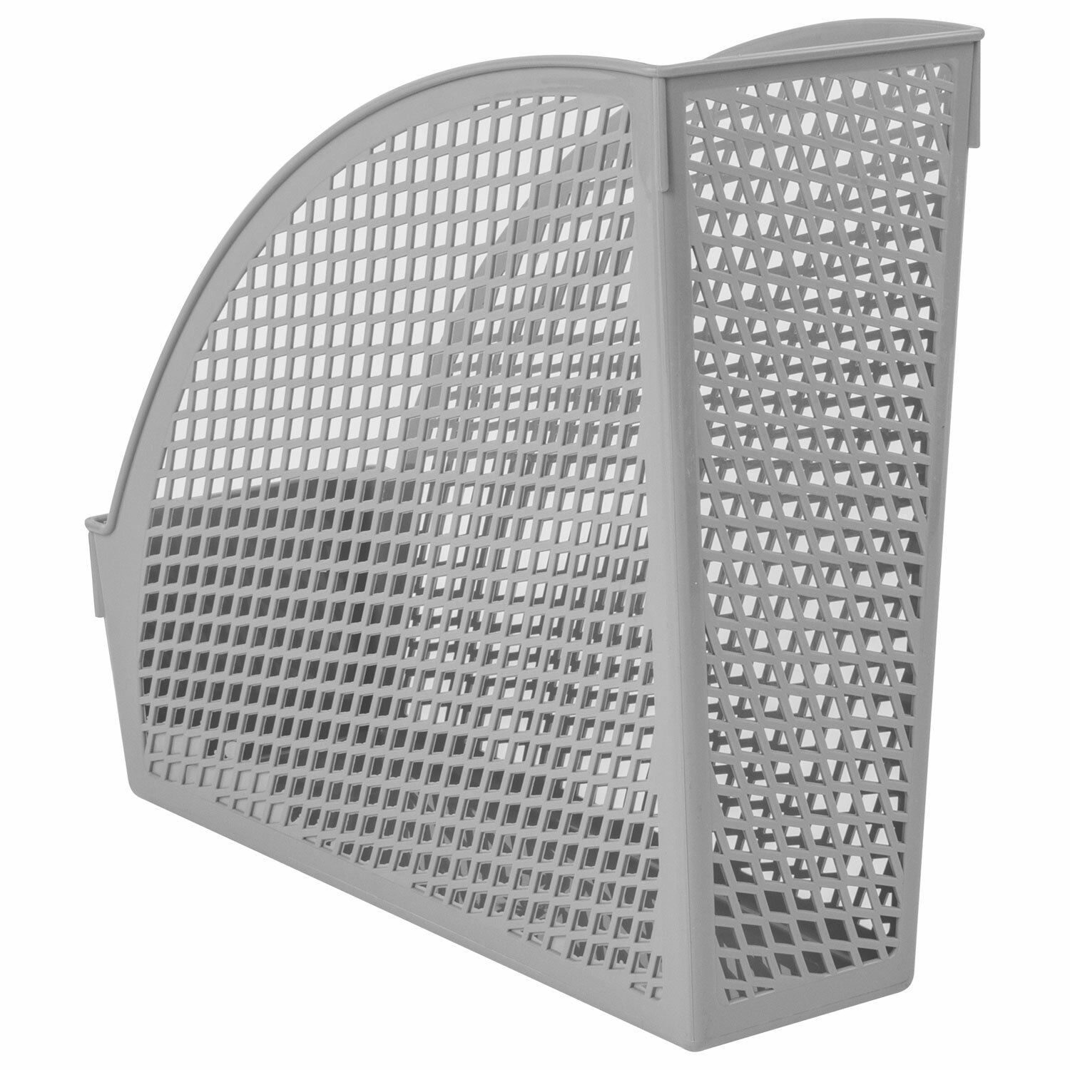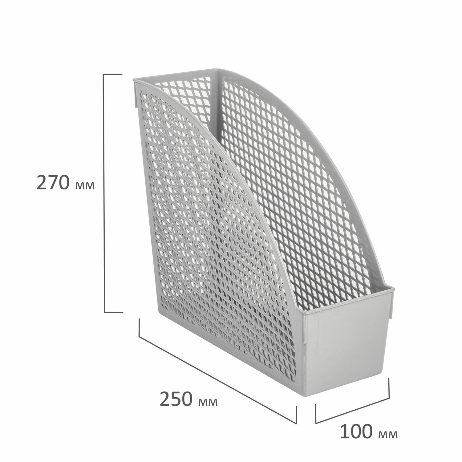 Выполнен в сером цвете из полипропилена с одним отделением. Предназначен для хранения бумаг формата А4. Представляет собой устойчивую неразборную конструкцию с прочной сетчатой поверхностью. Размеры: высота 270 мм, ширина 100 мм, глубина 250 мм.