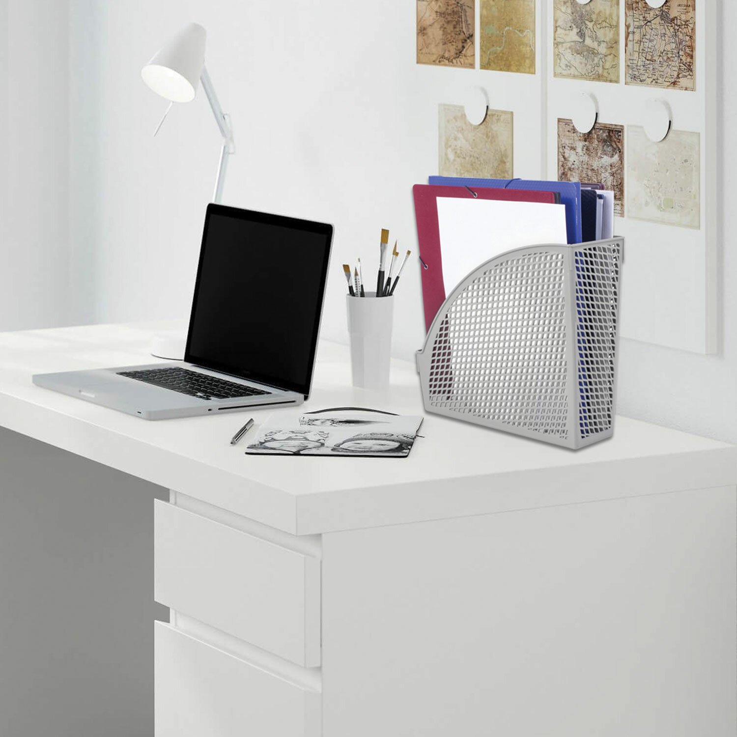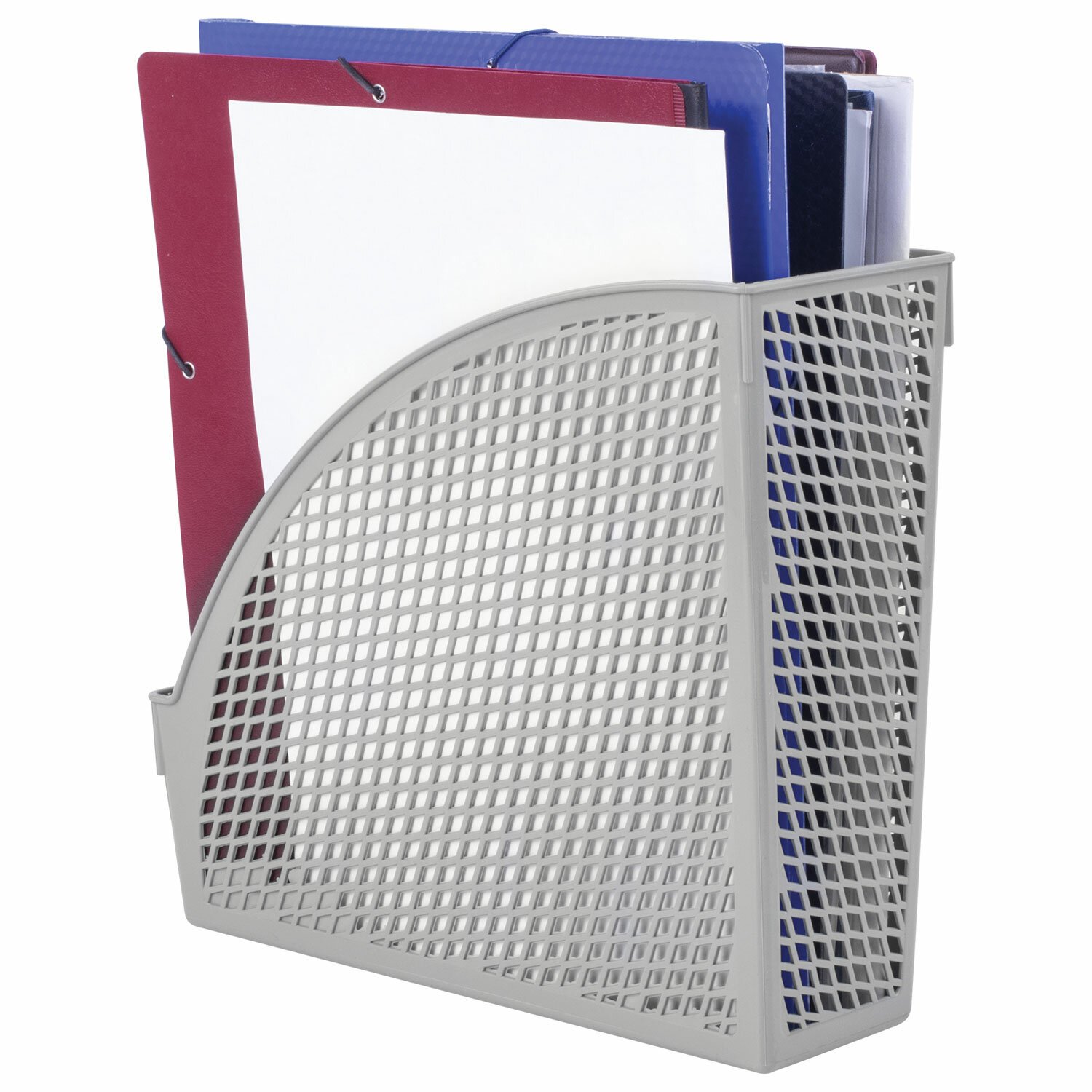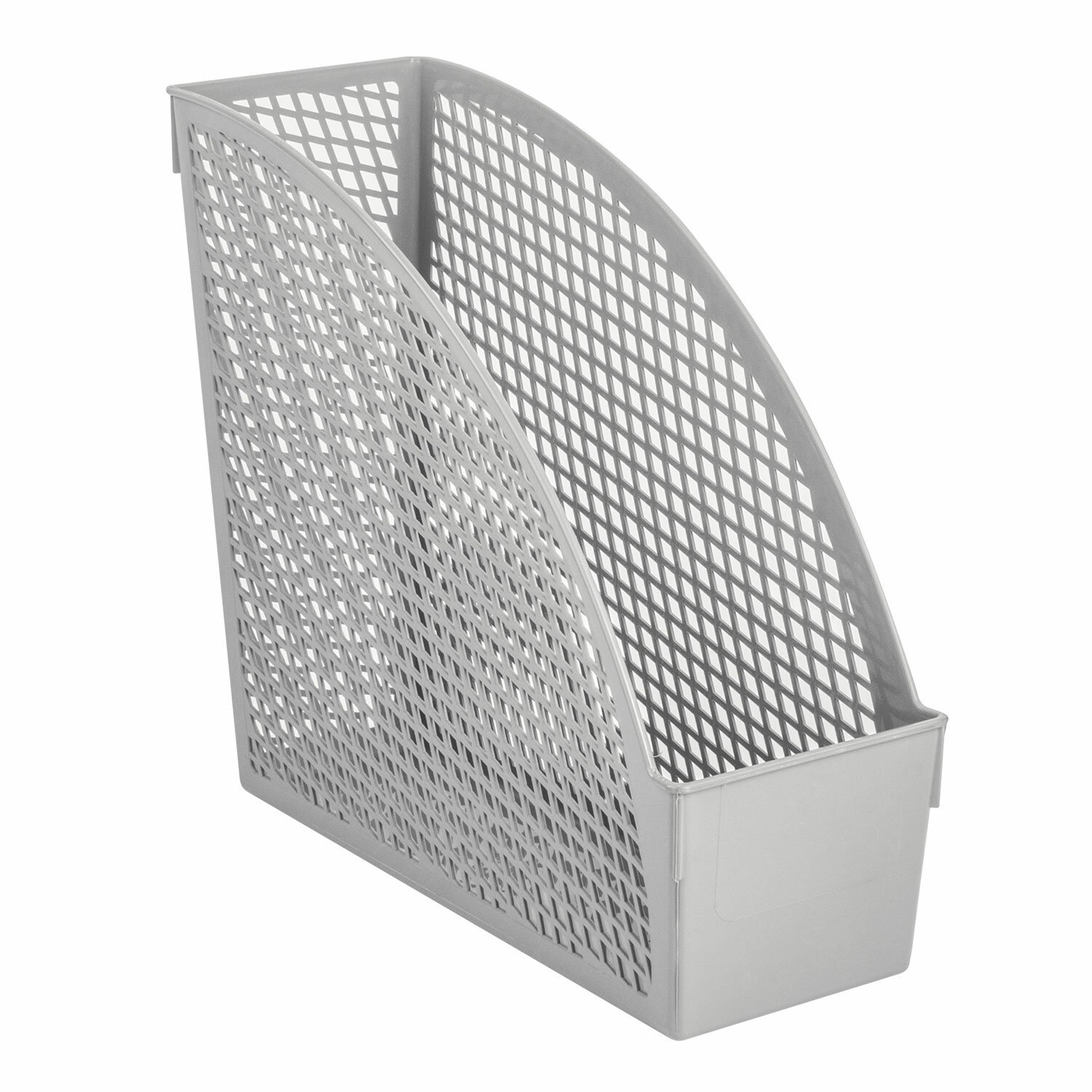 Выполнен в сером цвете из полипропилена с одним отделением. Предназначен для хранения бумаг формата А4. Представляет собой устойчивую неразборную конструкцию с прочной сетчатой поверхностью. Размеры: высота 270 мм, ширина 100 мм, глубина 250 мм.