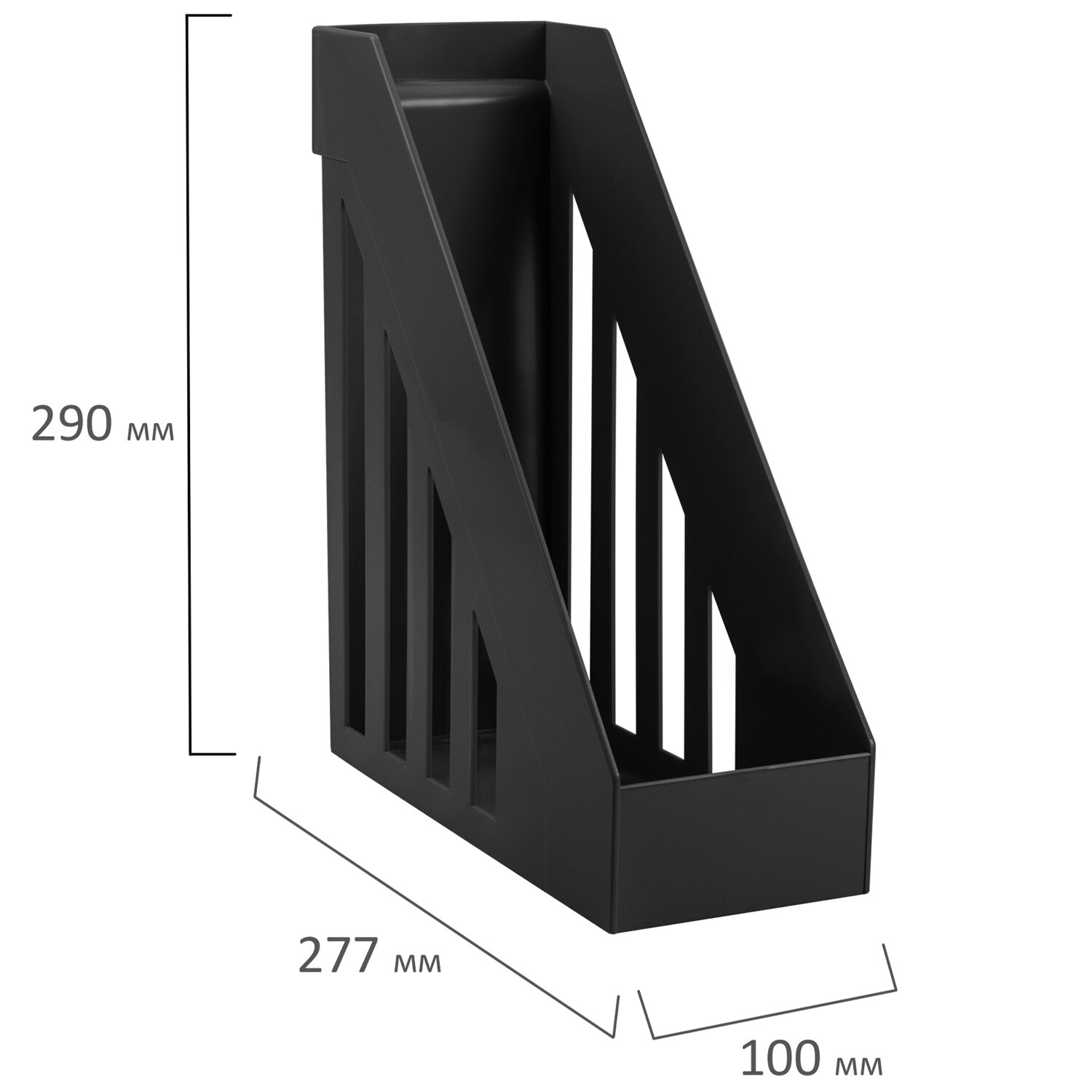 Выполнен в черном цвете, с одним отделением увеличенной ширины и с табличкой для маркировки. Предназначен для хранения бумаг формата А4. Представляет собой устойчивую неразборную конструкцию с отверстиями по бокам. Размеры: высота - 290 мм, ширина - 100 мм, глубина основания - 245 мм, полная глубина - 277 мм.