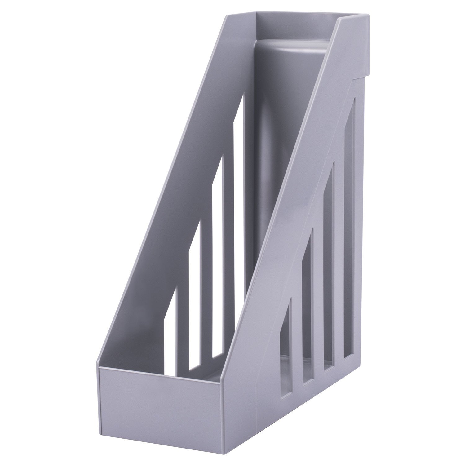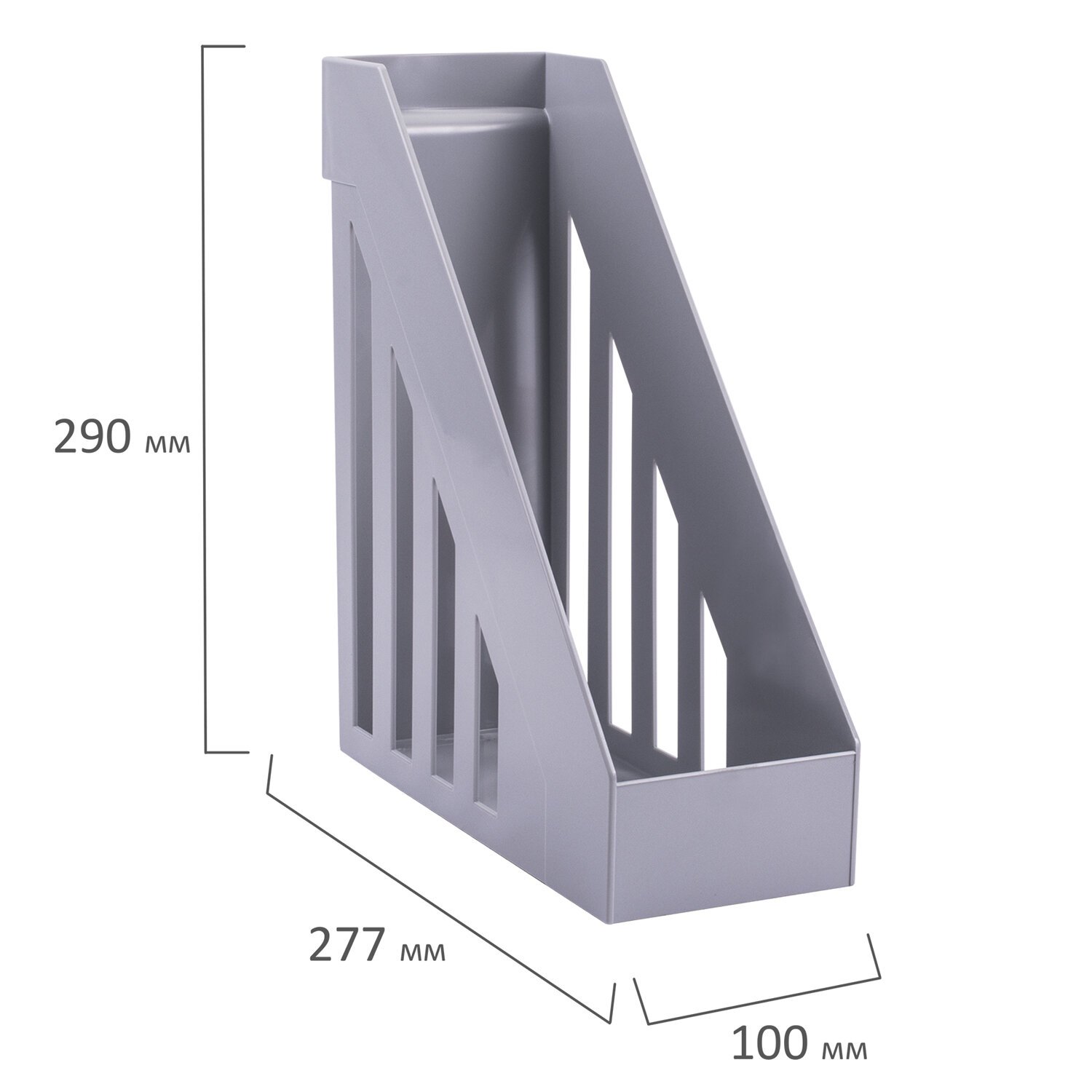 Выполнен в сером цвете, с одним отделением увеличенной ширины и с табличкой для маркировки. Предназначен для хранения бумаг формата А4. Представляет собой устойчивую неразборную конструкцию с отверстиями по бокам. Размеры: высота - 290 мм, ширина - 100 мм, глубина основания - 245 мм, полная глубина - 277 мм.