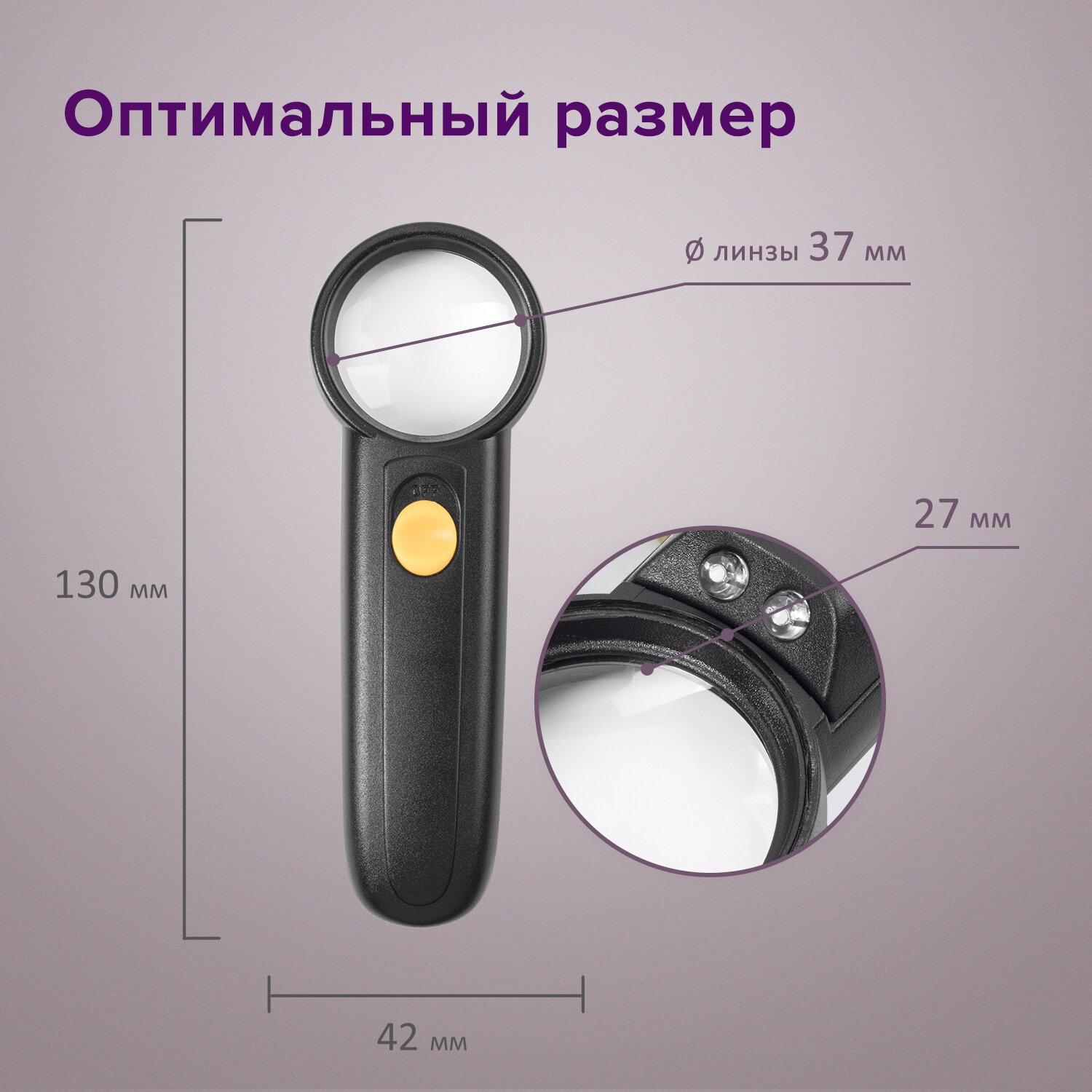 Лупа просмотровая BRAUBERG, С ПОДСВЕТКОЙ, диаметр 37 мм, увеличение 8, корпус черный, 454127