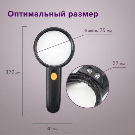 Лупа просмотровая BRAUBERG, С ПОДСВЕТКОЙ, диаметр 75 мм, увеличение 3, корпус черный, 454130
