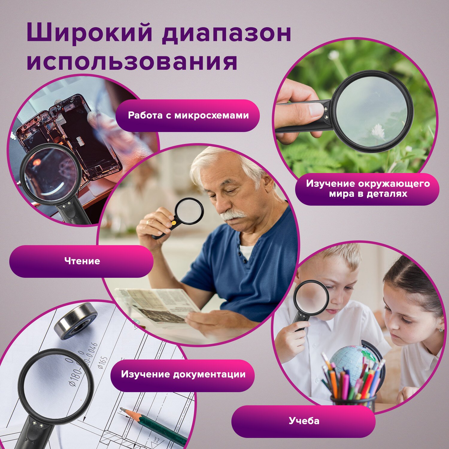 Лупа просмотровая с LED-ПОДСВЕТКОЙ, диаметр 90 мм, увеличение 10, корпус черный, BRAUBERG, 455928
