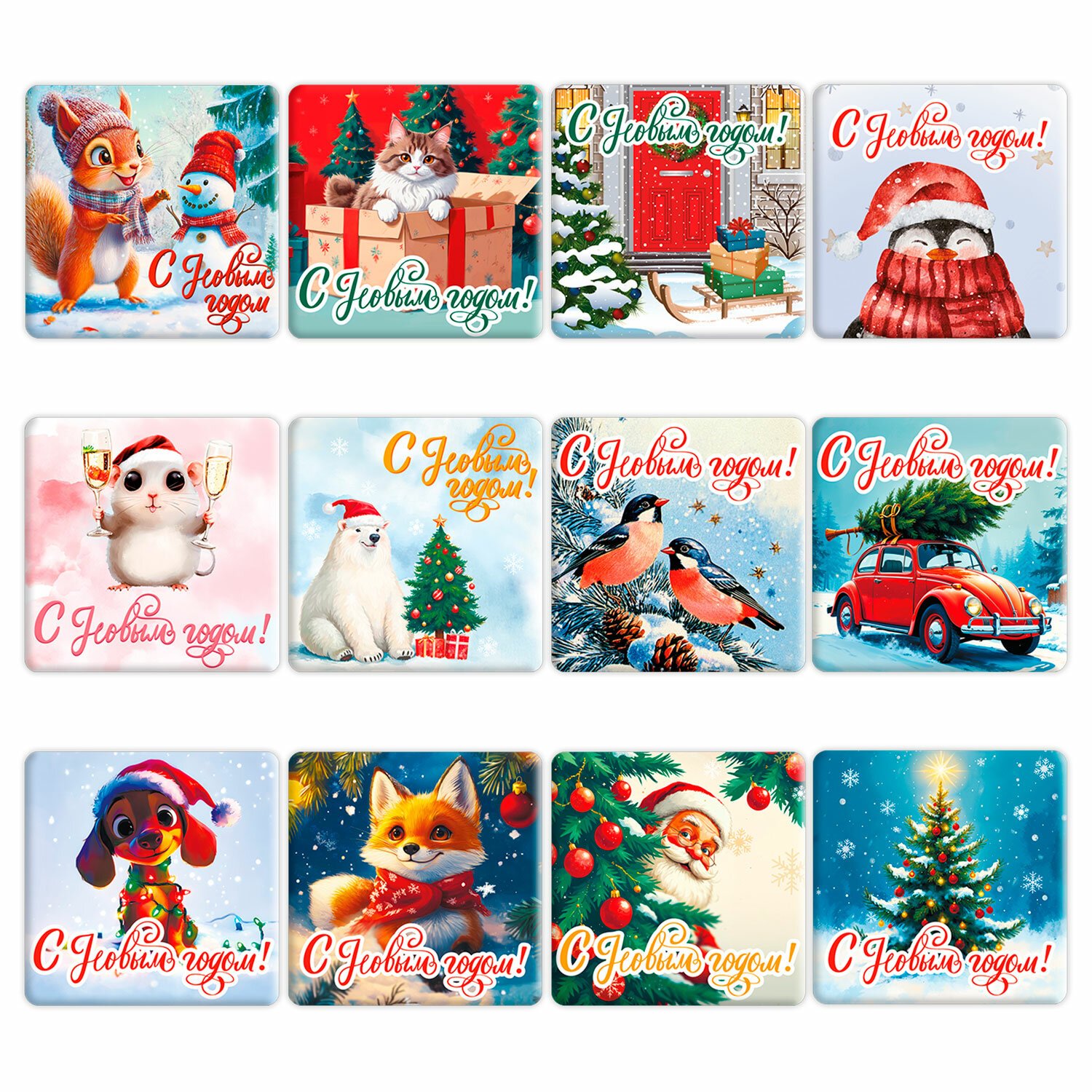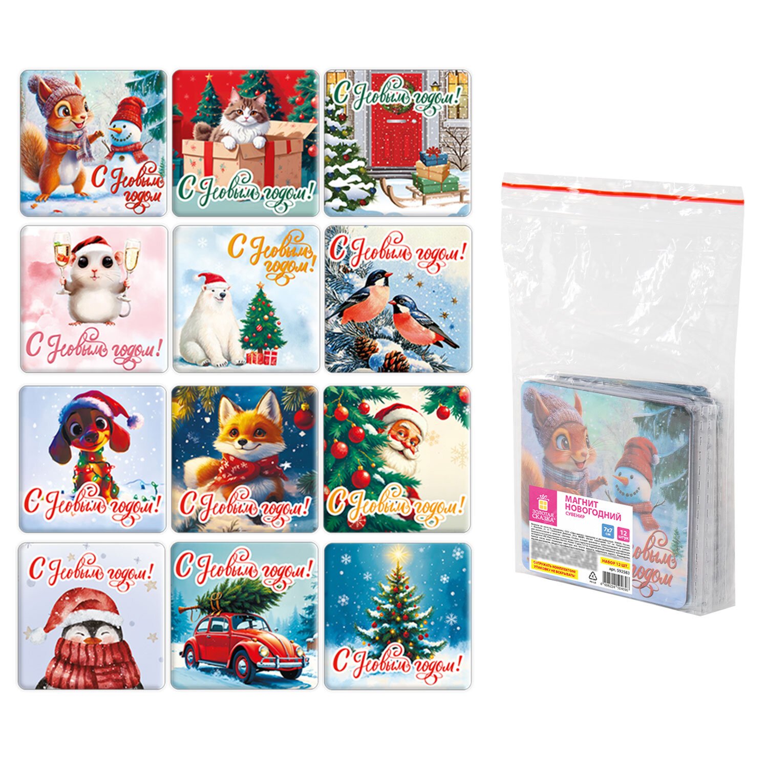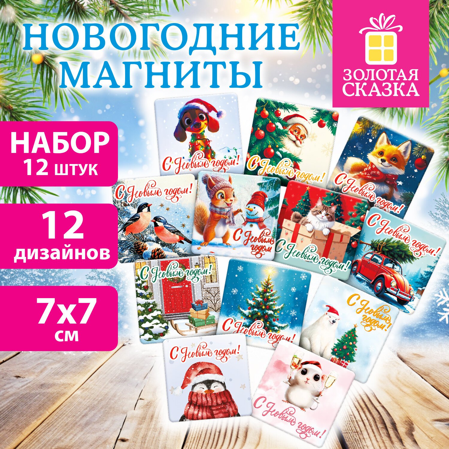 Магниты новогодние НАБОР 12 шт, 7х7 см, "Веселый Новый Год", ЗОЛОТАЯ СКАЗКА, 592583