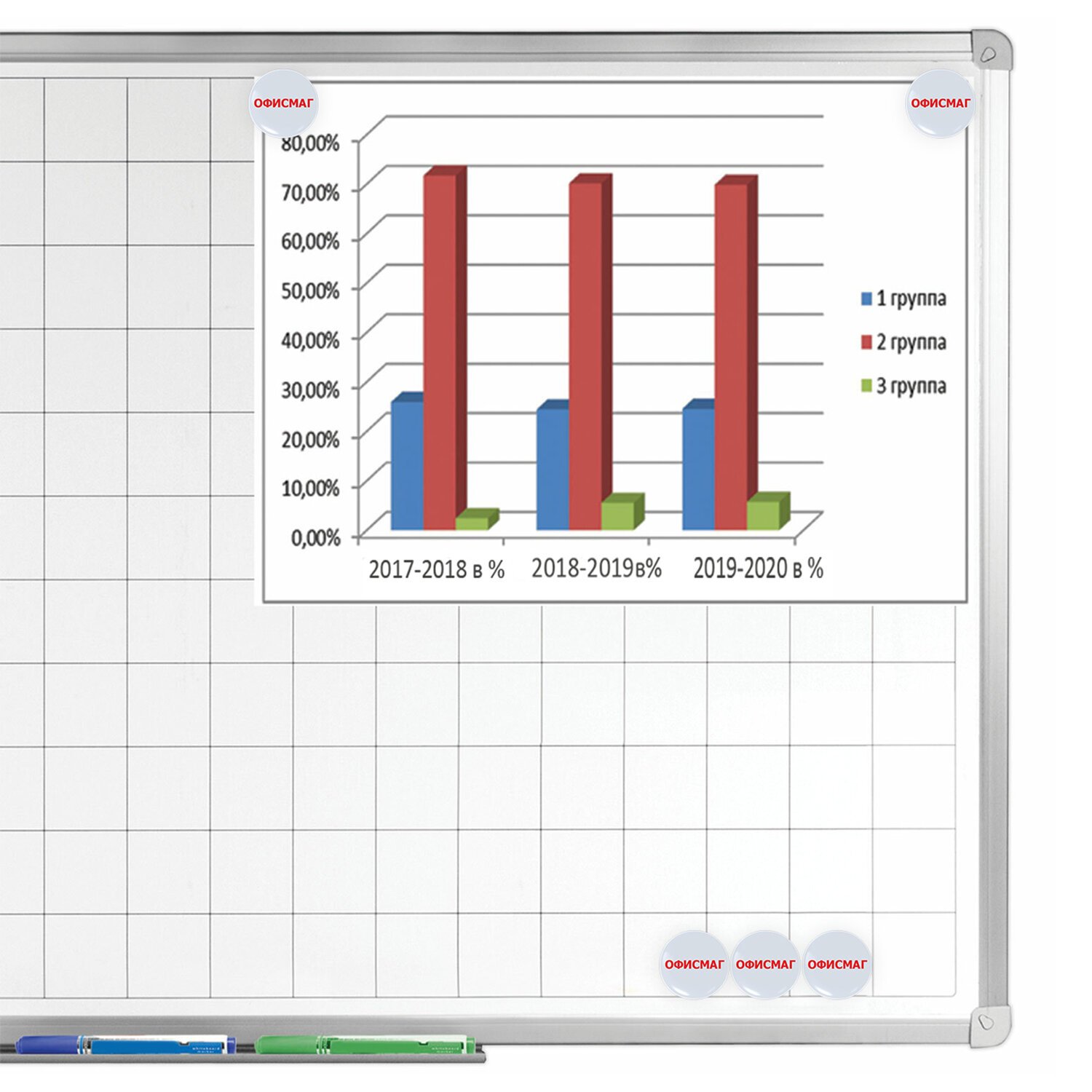 Магниты ОФИСМАГ с фирменной надписью помогут надежно прикрепить листы бумаги к магнитной поверхности досок, витрин и флипчартов.
