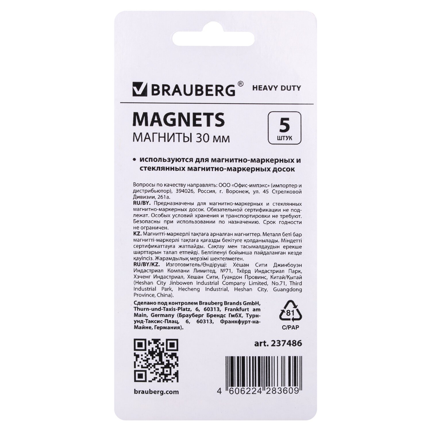 Магниты СУПЕРМОЩНЫЕ НЕОДИМОВЫЕ 30 мм, НАБОР 5 шт., серые, BRAUBERG "HEAVY DUTY", 237486