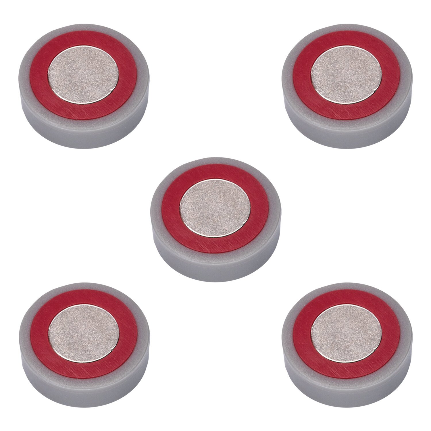 Магниты круглой формы стандартного диаметра – 30 мм, но с повышенной магнитной силой. Цвет – серый. Изготовлены из пластика. Упакованы в удобную и надежную блистерную упаковку с европодвесом. В комплекте 5 штук.