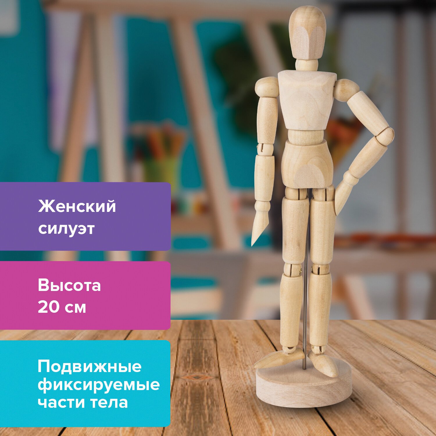 Деревянный манекен BRAUBERG ART "CLASSIC", изображающий женскую человеческую фигуру с подвижными руками, ногами, головой. Применяется художниками для зарисовки различных человеческих поз.