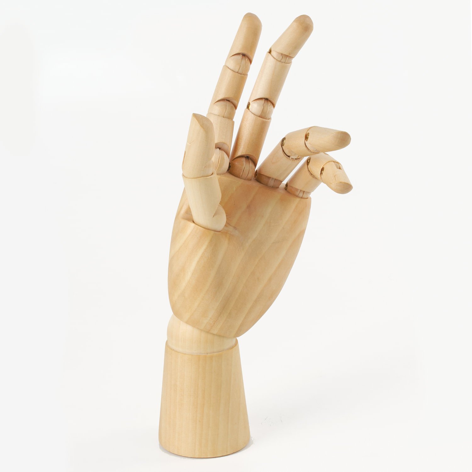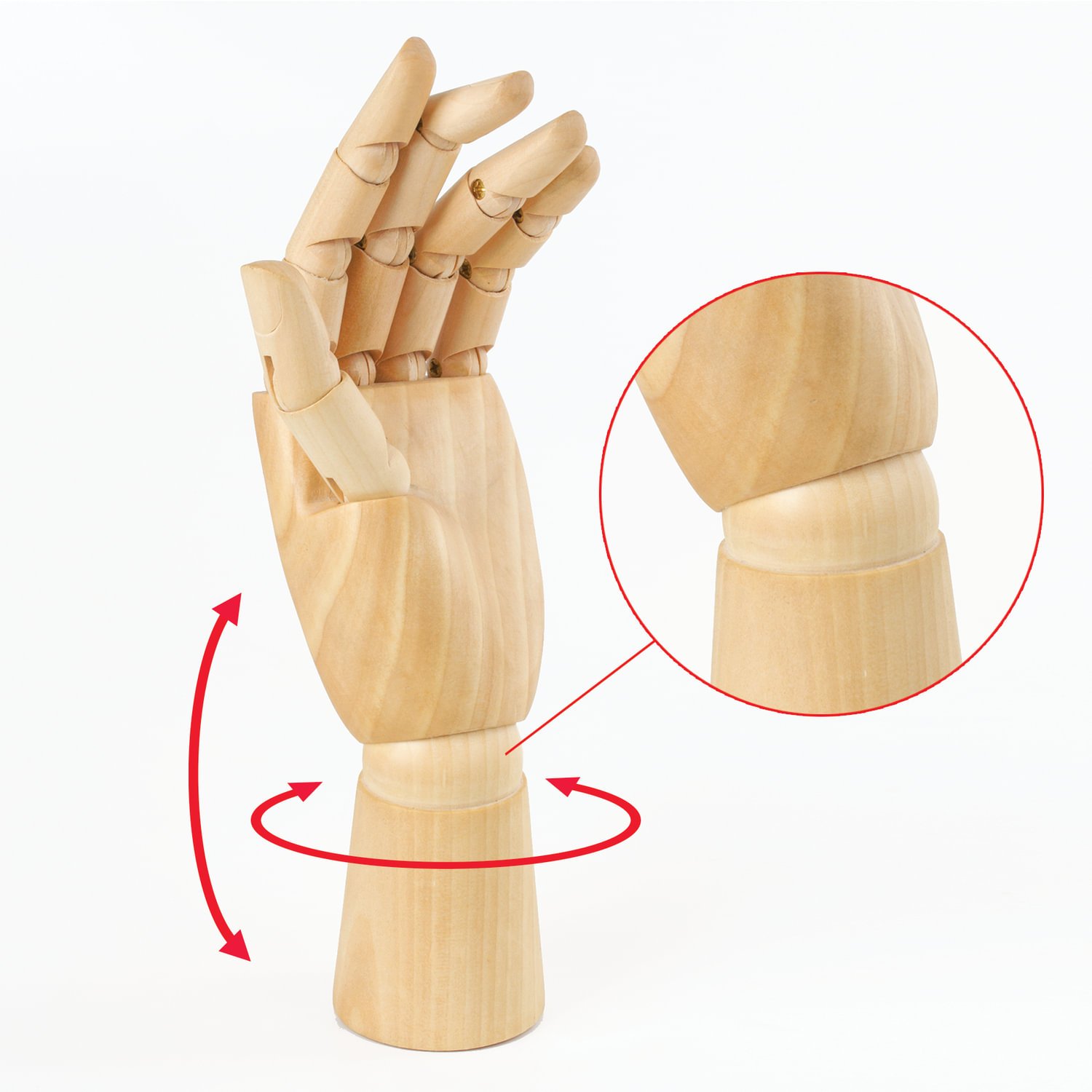 Манекен изготовлен из дерева, представляет из себя модель женской левой руки, способной сгибаться в местах сгиба фаланг пальцев и в области запястья. Соединения предоставляют возможность зафиксировать модель в необходимом положении. Манекен является отличной альтернативой живой натуре, поскольку не может случайно это положение поменять. Высота - 25 см. Упакован в белую коробку.