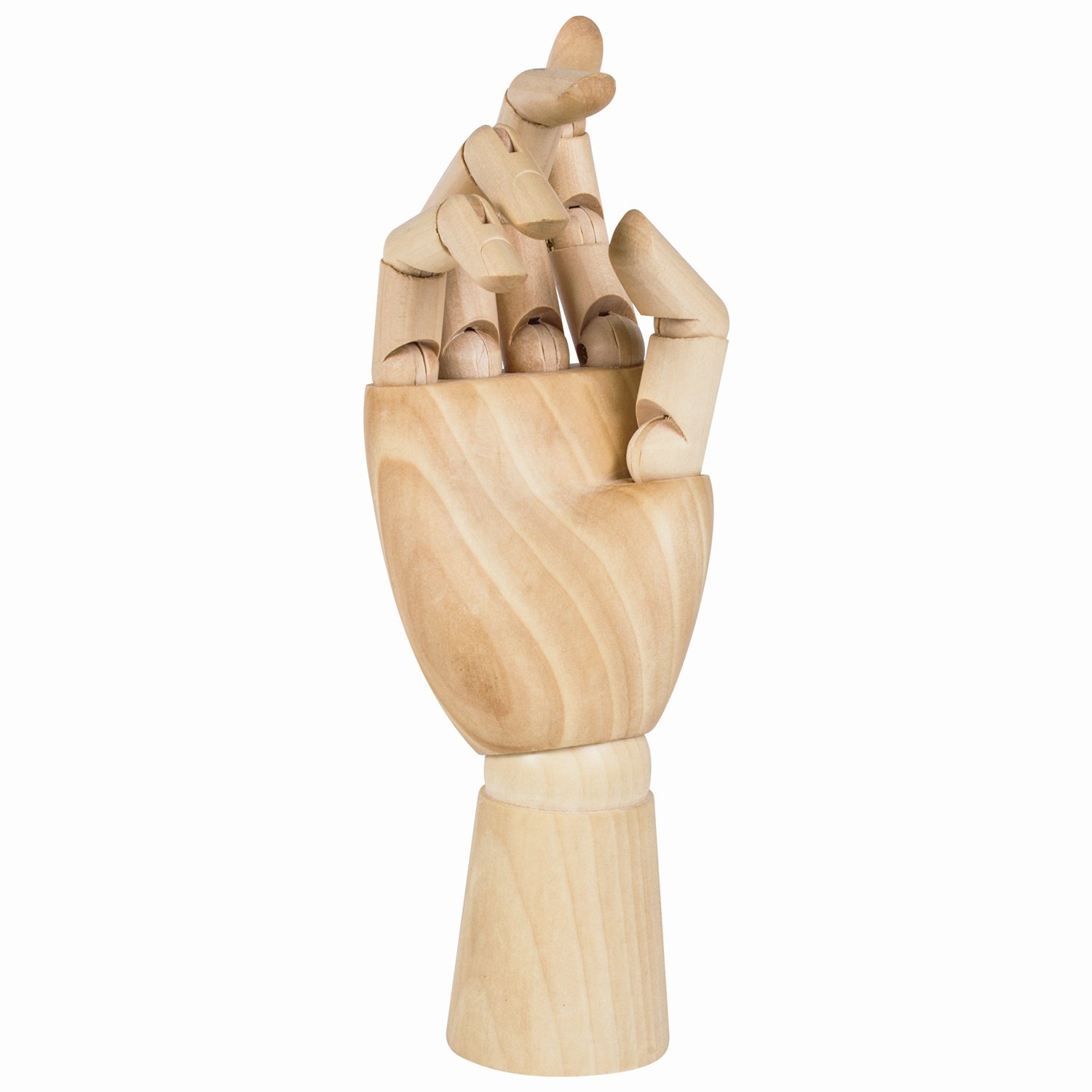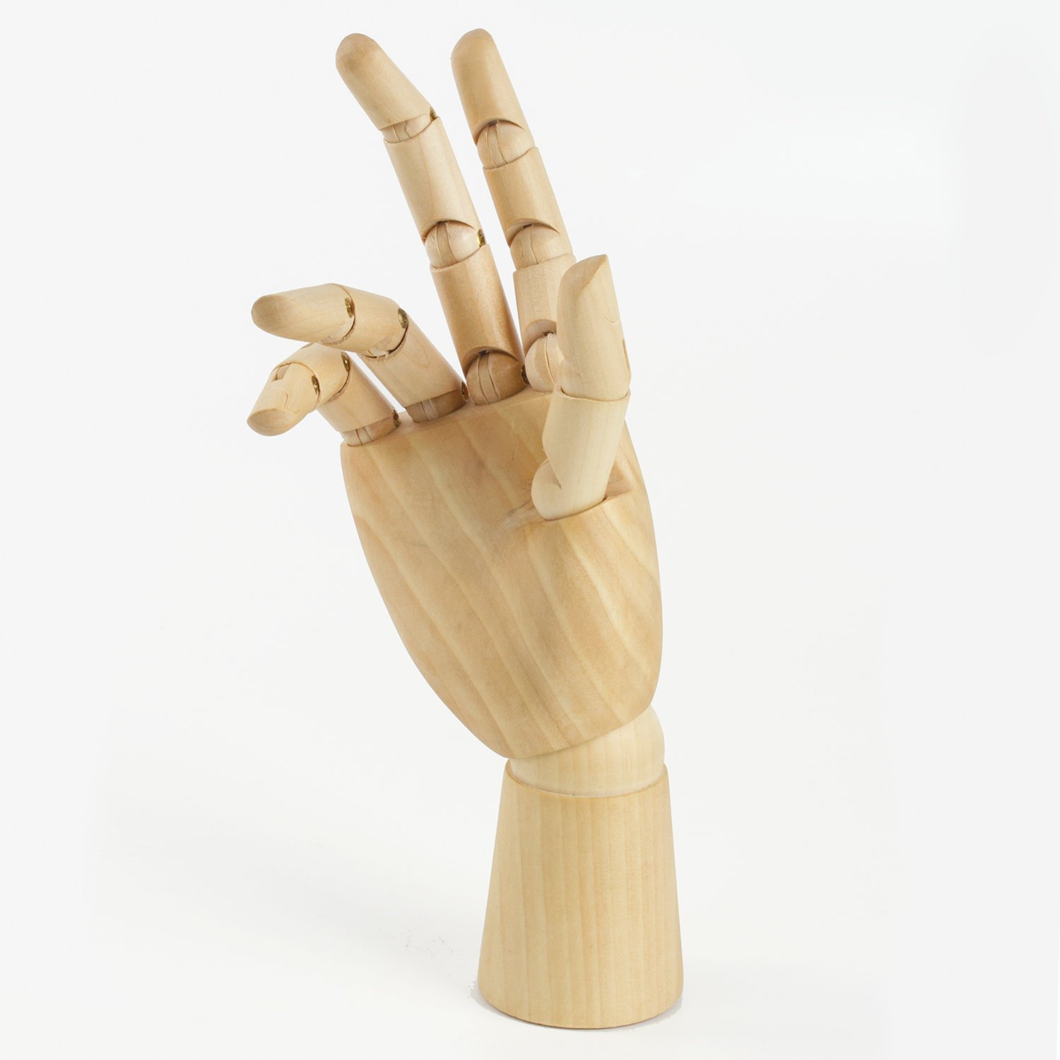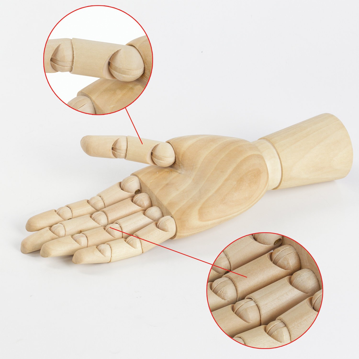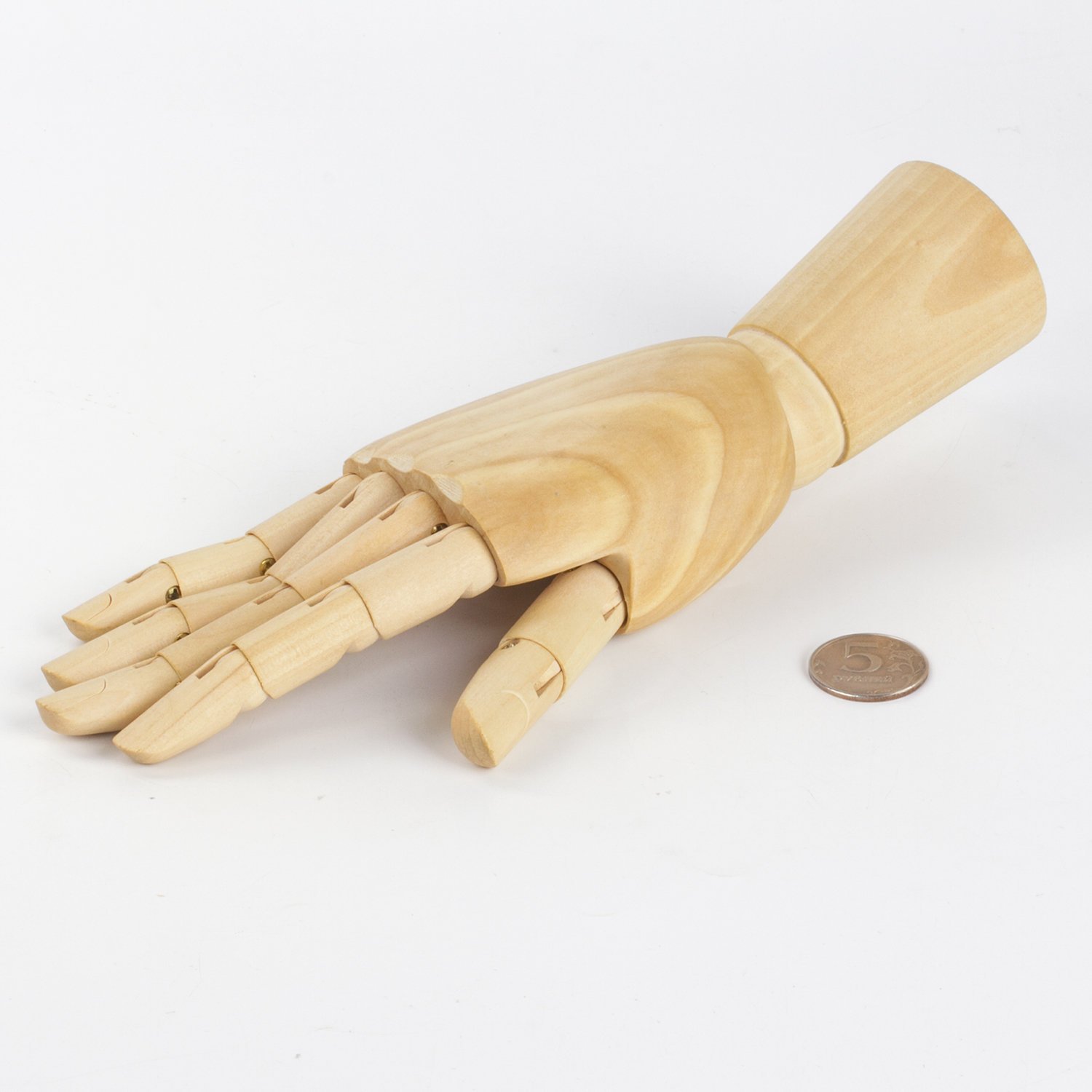 Манекен изготовлен из дерева, представляет из себя модель женской правой руки, способной сгибаться в местах сгиба фаланг пальцев и в области запястья. Соединения предоставляют возможность зафиксировать модель в необходимом положении. Манекен является отличной альтернативой живой натуре, поскольку не может случайно это положение поменять. Высота - 25 см. Упакован в белую коробку.