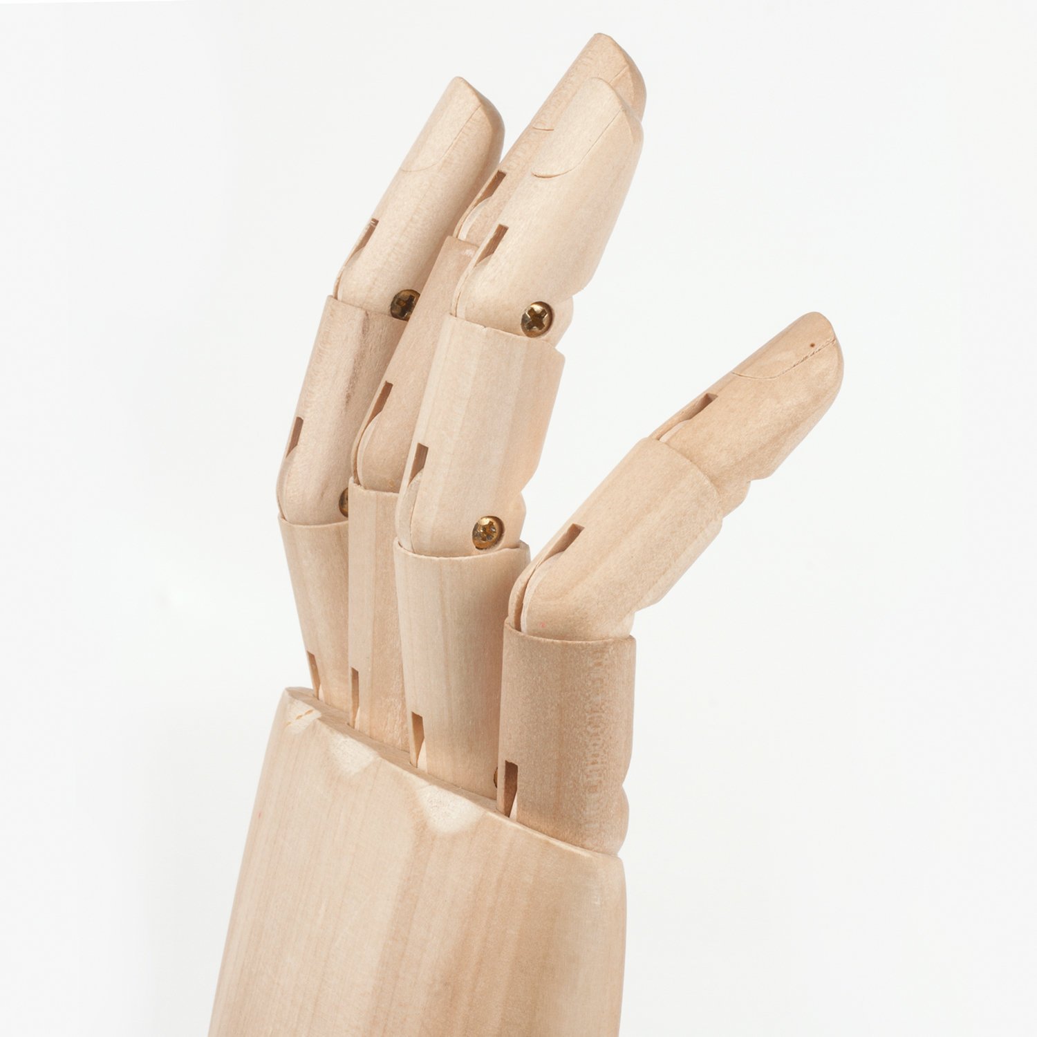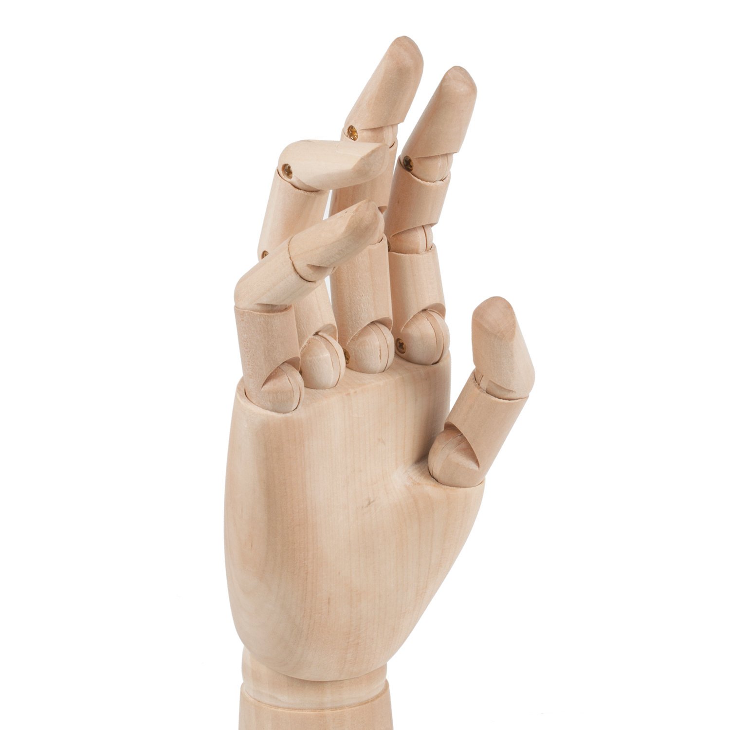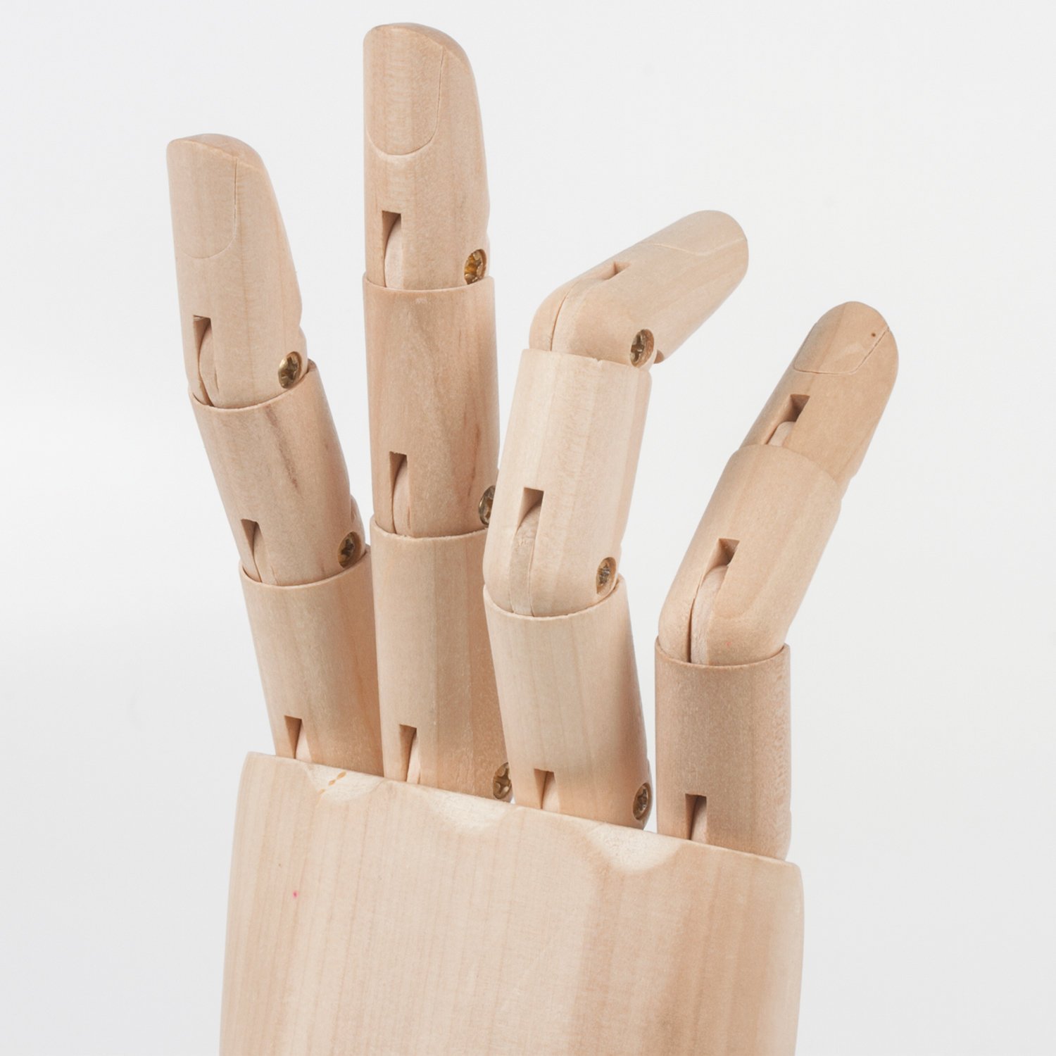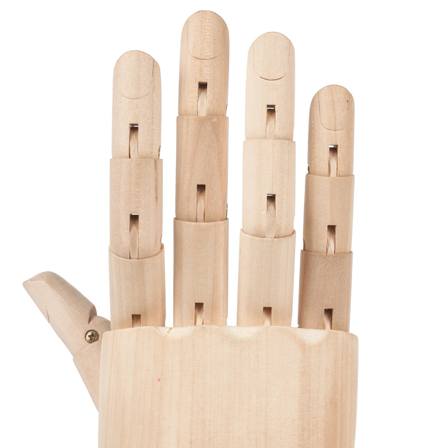 Манекен изготовлен из дерева, представляет из себя модель мужской левой руки, способной сгибаться в местах сгиба фаланг пальцев и в области запястья. Соединения предоставляют возможность зафиксировать модель в необходимом положении. Манекен является отличной альтернативой живой натуре, поскольку не может случайно это положение поменять. Высота - 30 см. Упакован в белую коробку.