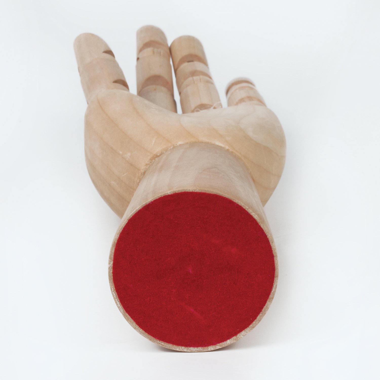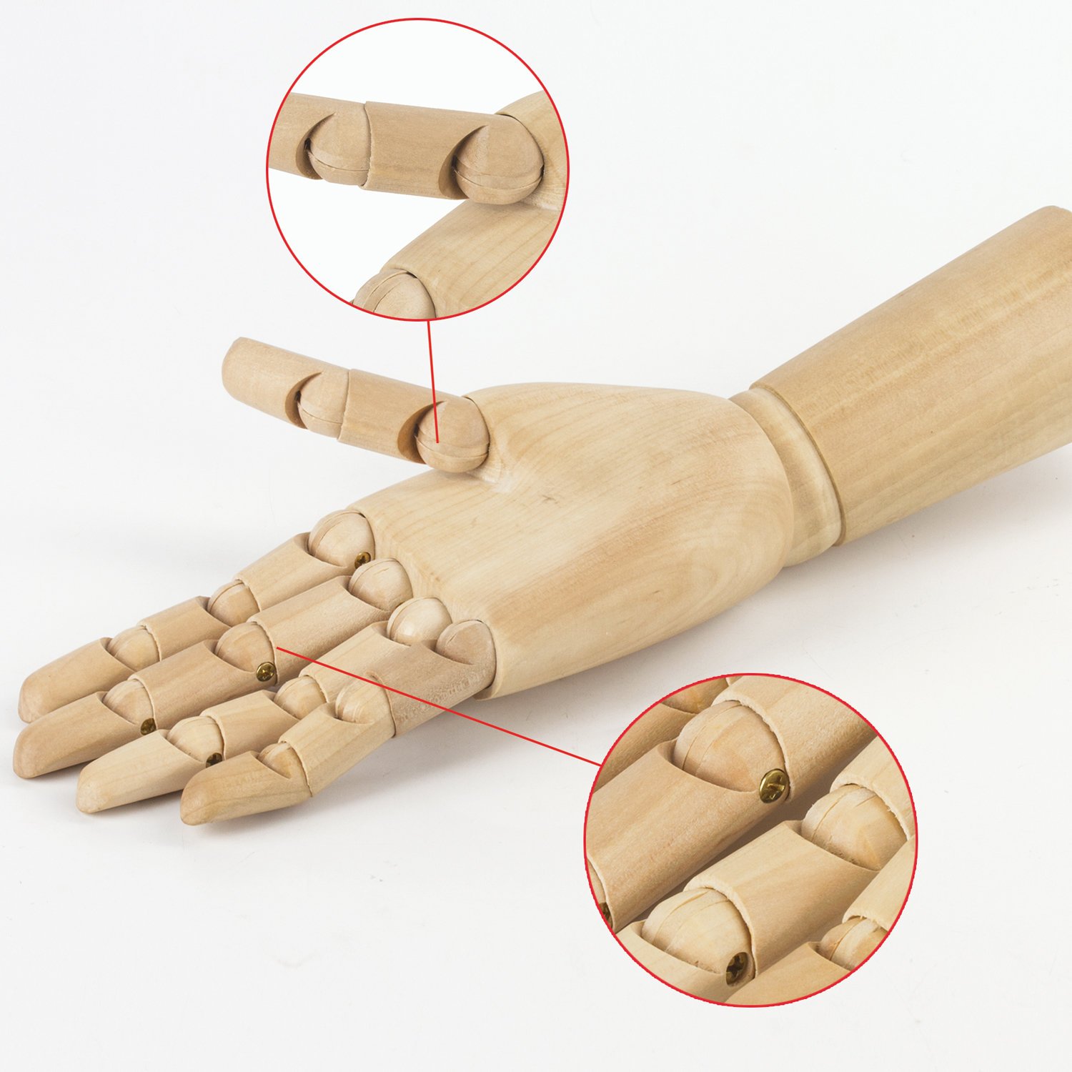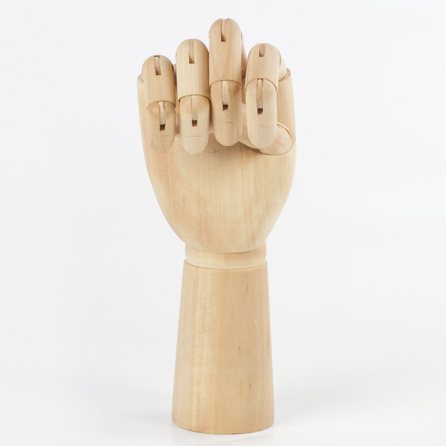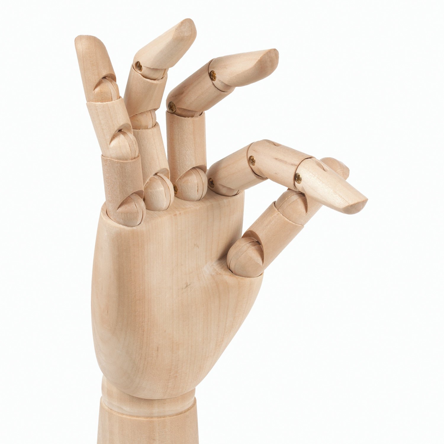 Манекен изготовлен из дерева, представляет из себя модель мужской левой руки, способной сгибаться в местах сгиба фаланг пальцев и в области запястья. Соединения предоставляют возможность зафиксировать модель в необходимом положении. Манекен является отличной альтернативой живой натуре, поскольку не может случайно это положение поменять. Высота - 30 см. Упакован в белую коробку.