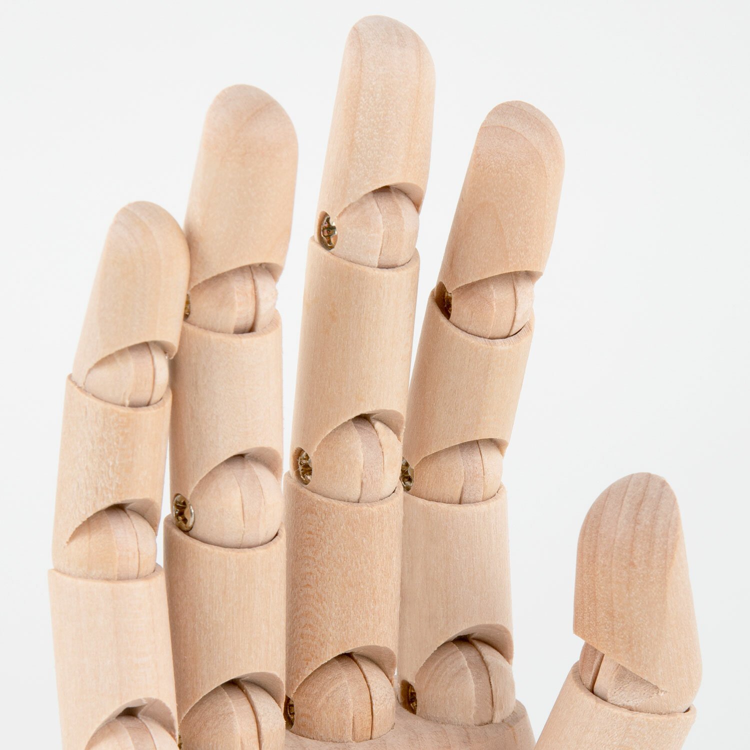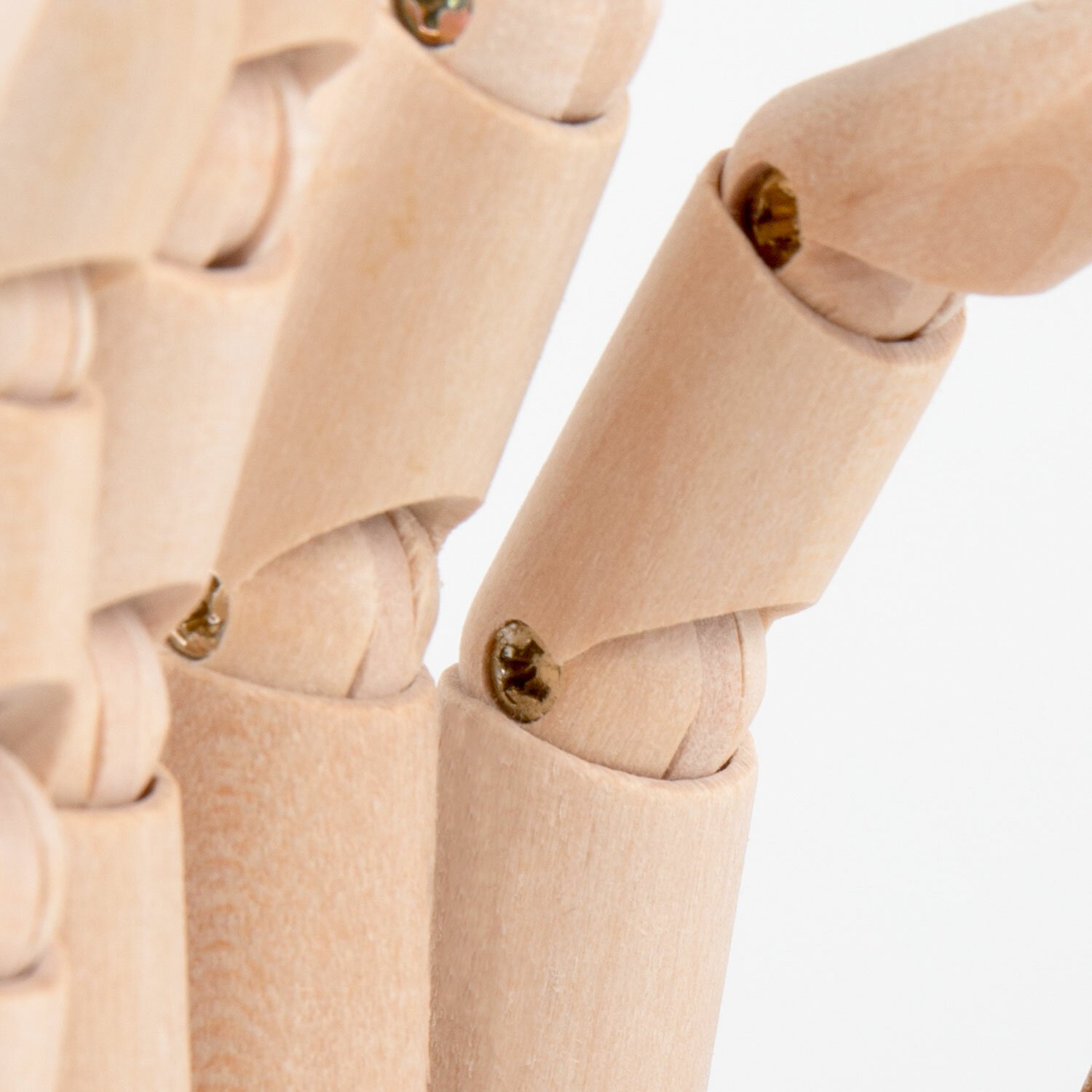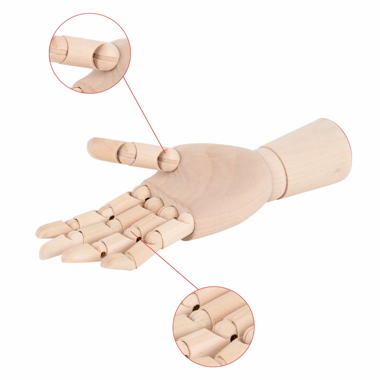 Манекен изготовлен из натурального дерева и представляет собой модель правой руки, которая может сгибаться в суставах пальцев и в области запястья. Соединения позволяют зафиксировать руку в необходимом положении.