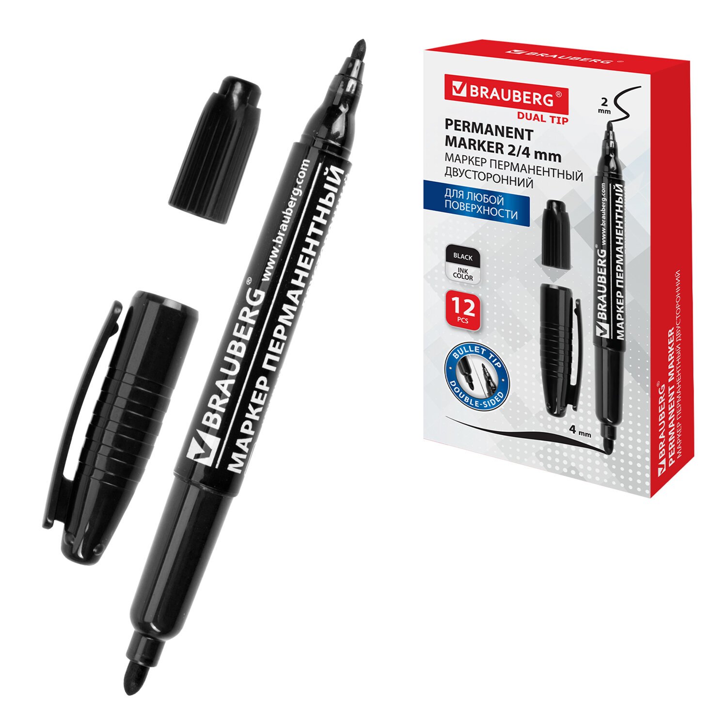 Маркер перманентный двусторонний BRAUBERG, ЧЕРНЫЙ, круглый наконечник, 2/4 мм, 150836