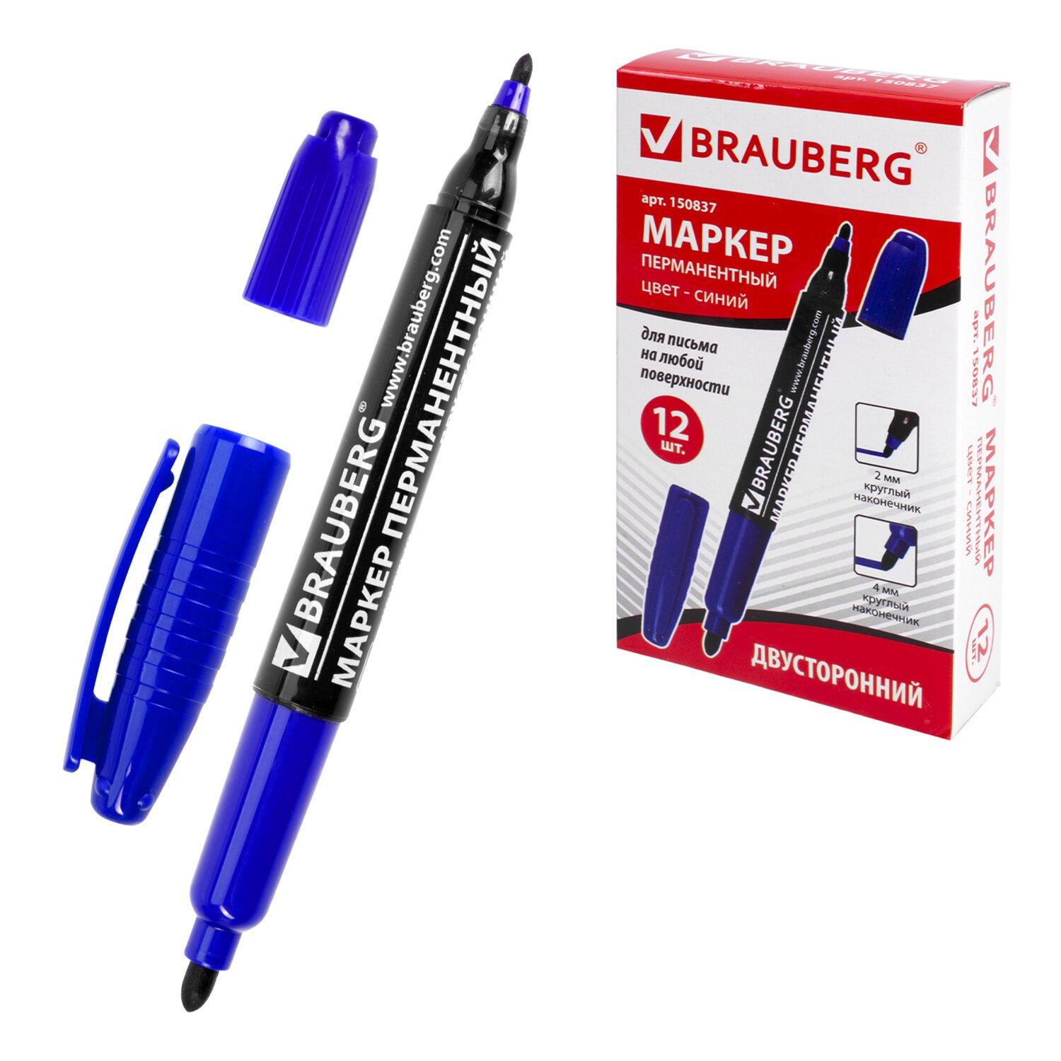 Маркер перманентный двусторонний BRAUBERG, СИНИЙ, круглый наконечник, 2/4 мм, 150837