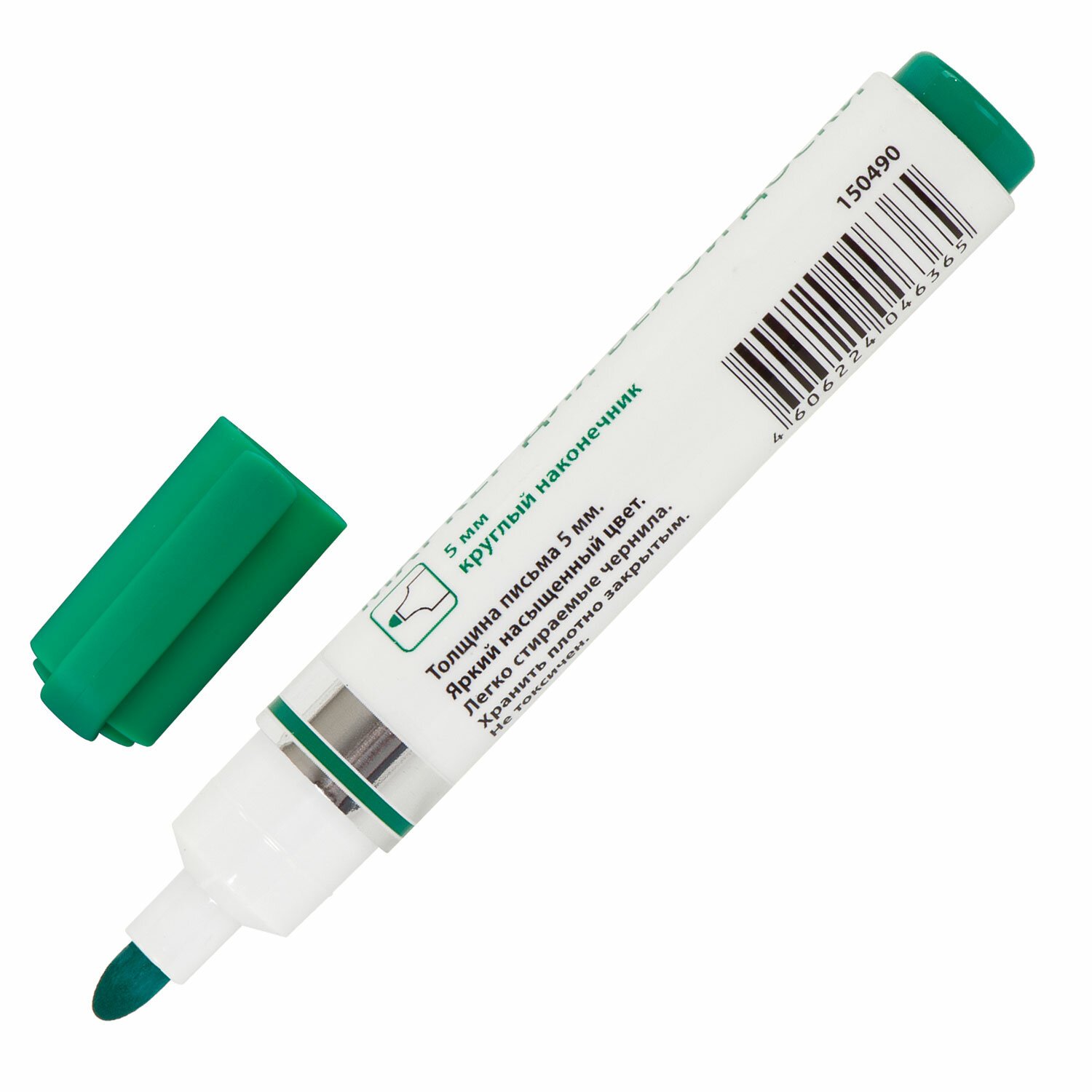 Маркер для доски зеленого цвета обладает круглым пластиковым корпусом диаметром 19 мм. Наконечник круглой формы обеспечивает толщину линии письма 5 мм, что позволяет писать крупным шрифтом, который будет хорошо виден. Благодаря спиртовой основе, чернила быстро высыхают и не оставляют разводов, легко стираются сухой губкой. Изделие не перезаправляется. Цвет колпачка соответствует цвету чернил.