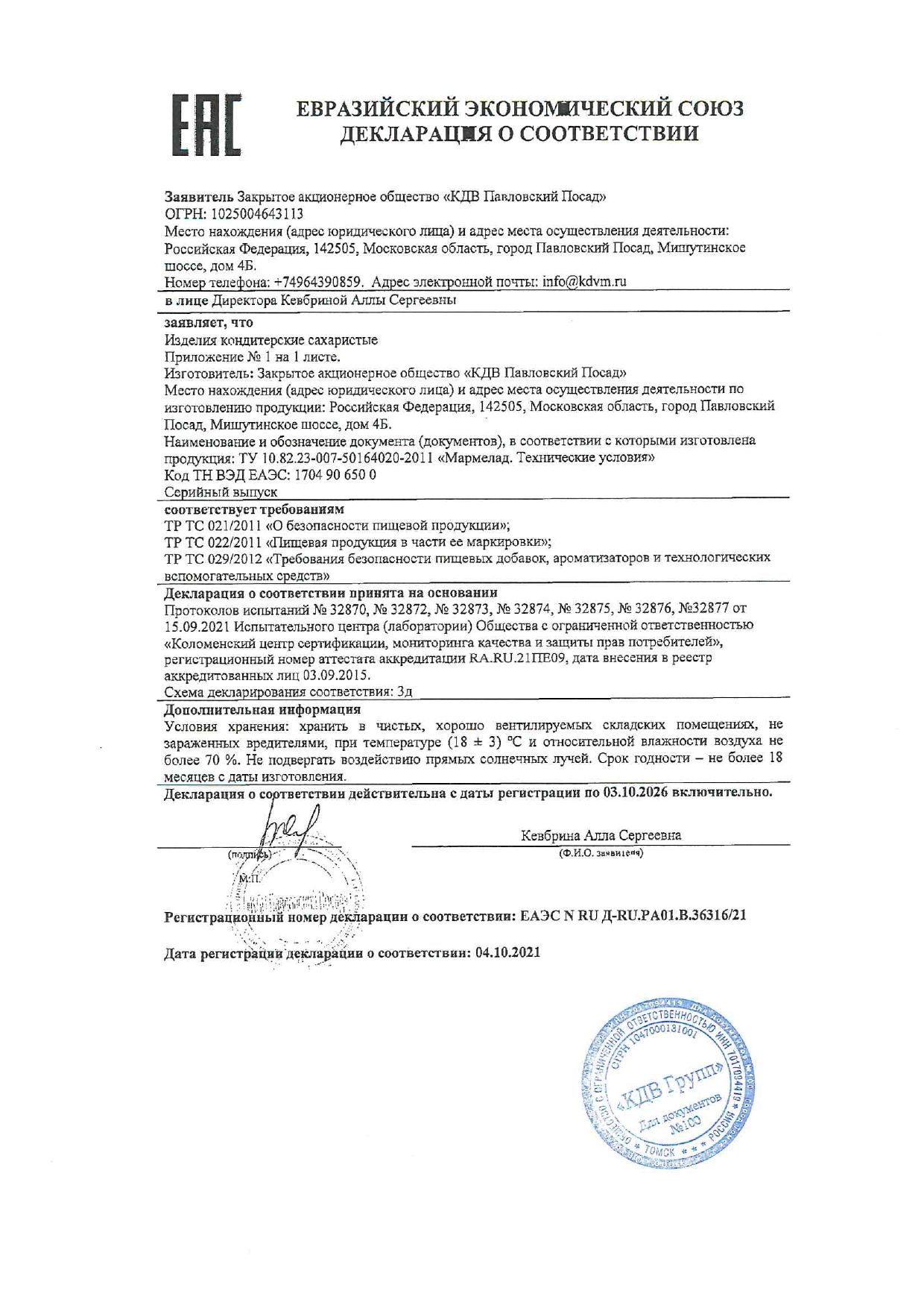 | Соответствует требованиям ГОСТа | ТУ 10.82.23-007-50164020-2011 |