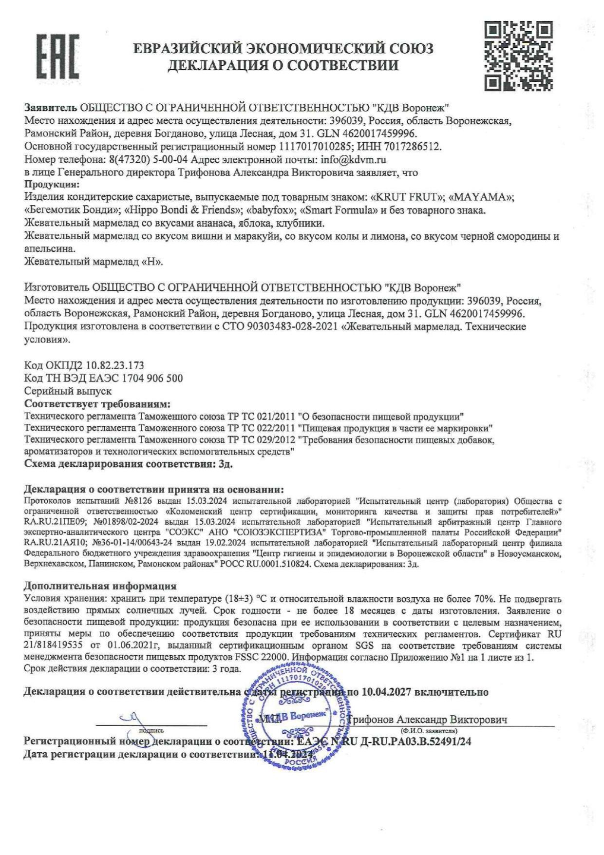 Состав продукта: глюкозно-фруктозный сироп, сахар, желатин, концентрированный яблочный сок, регулятор кислотности: лимонная кислота; агент желирующий: пектины; комплексная пищевая добавка (глазирователи: воск карнаубский, воск пчелиный; антиокислители: альфа-токоферол, Е304(i)); концентрированный сок из черной моркови, смесь концентрированных соков моркови, черной смородины; ароматизаторы, красители: Е150c; кармины, уголь растительный, каротины, медные комплексы хлорофиллинов, куркумин. Продукт может содержать консервант диоксид серы.