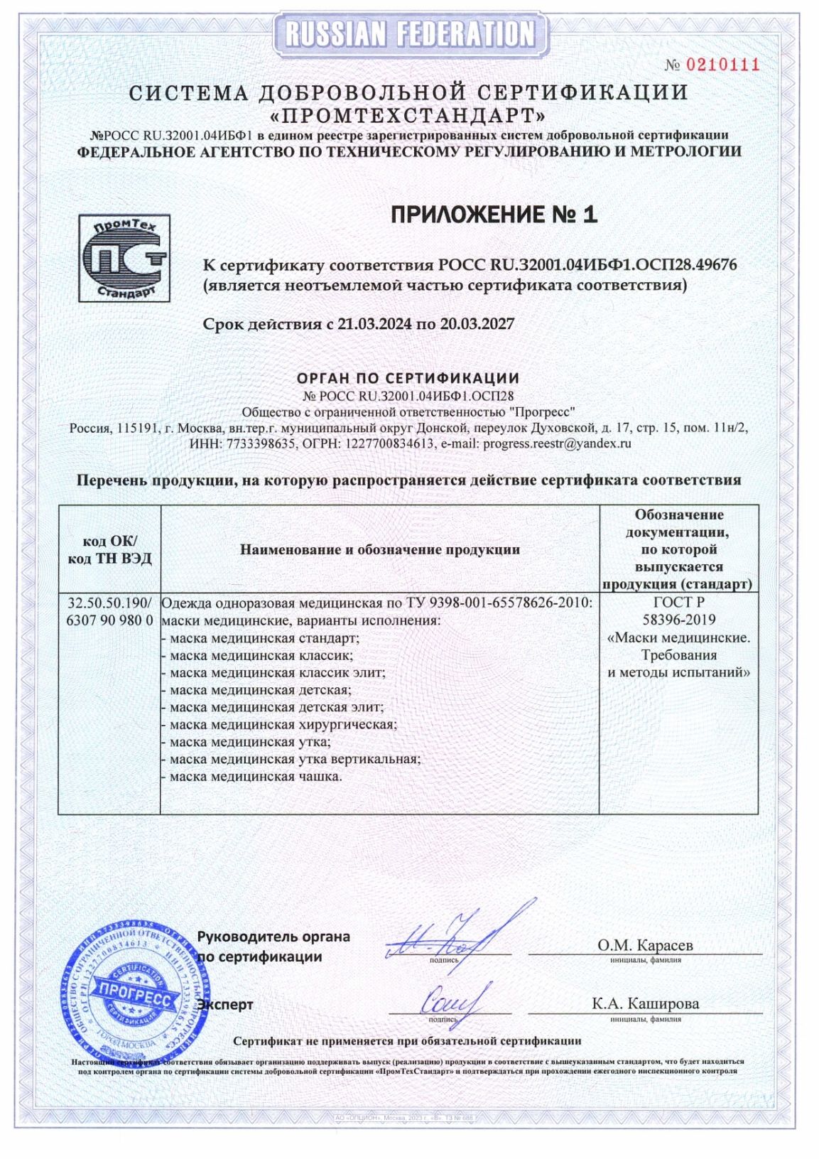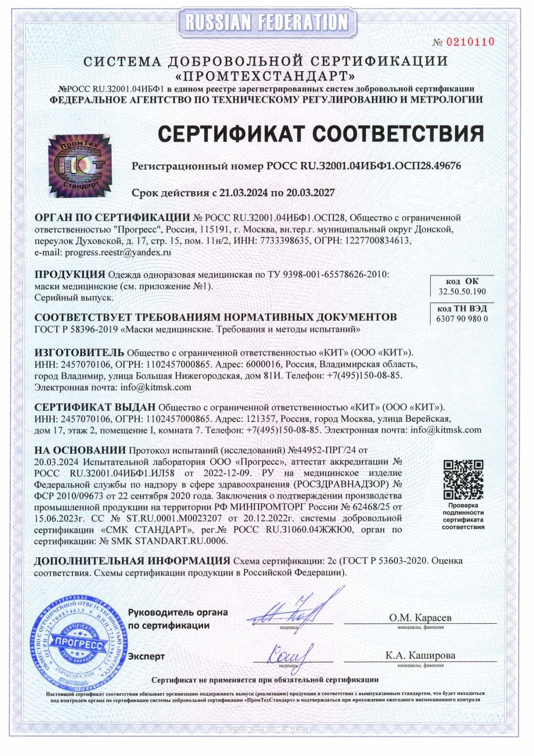 Маски снабжены носовым фиксатором и мягкой резинкой-держателем. Они обеспечивают 99% защиту от болезнетворных микробов и грибков. Материал масок антистатичен, прекрасно пропускает воздух и не вызывает раздражений. Размер – 18х9 см.