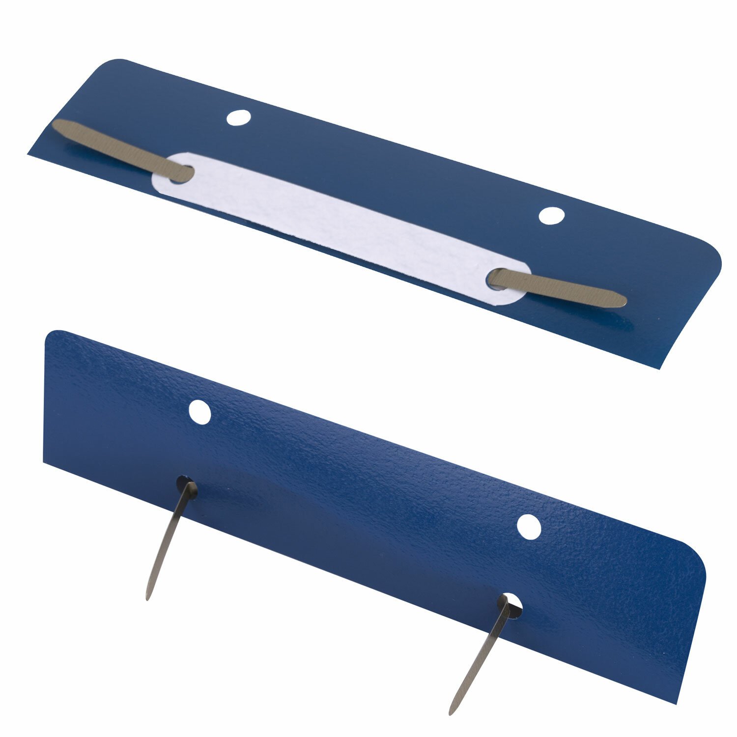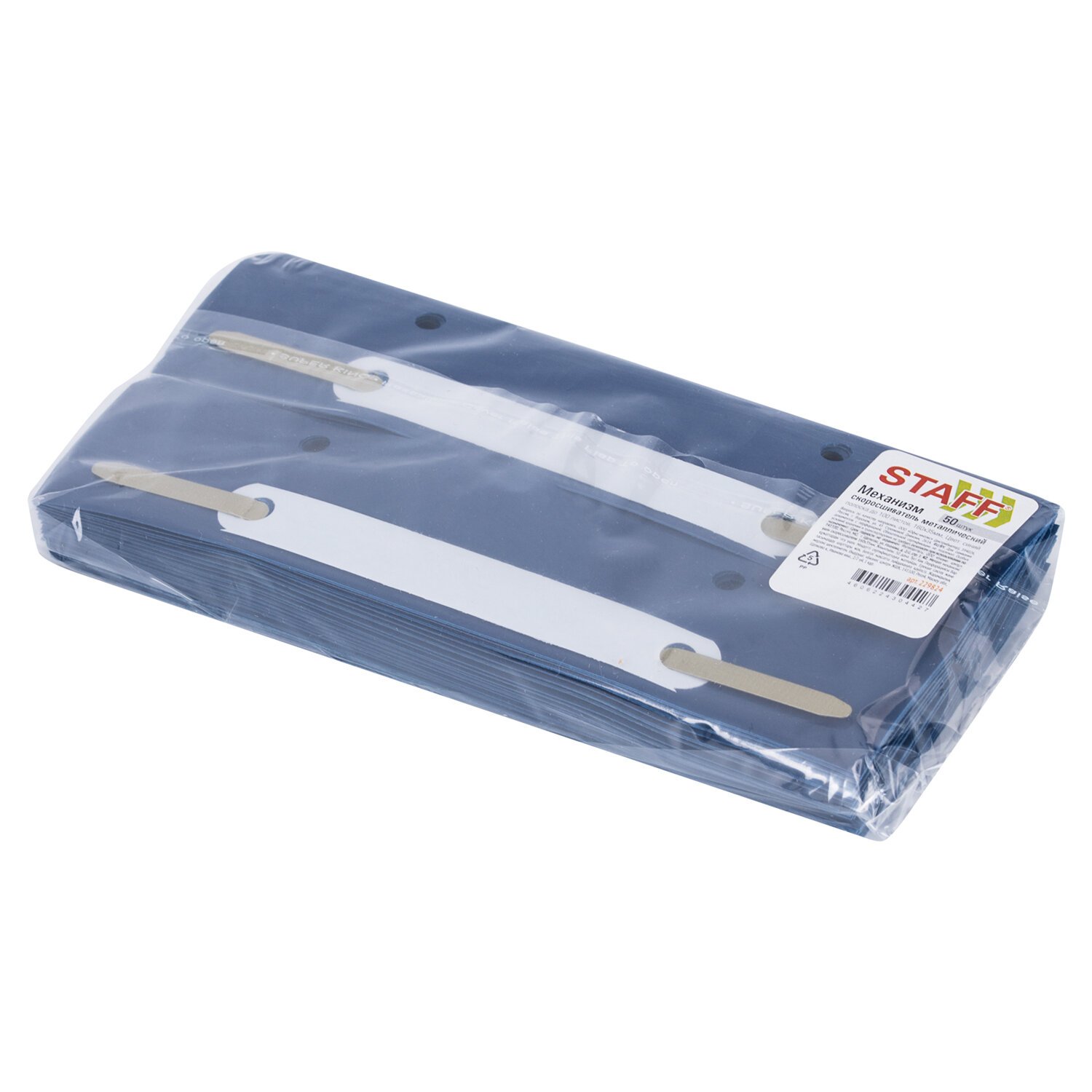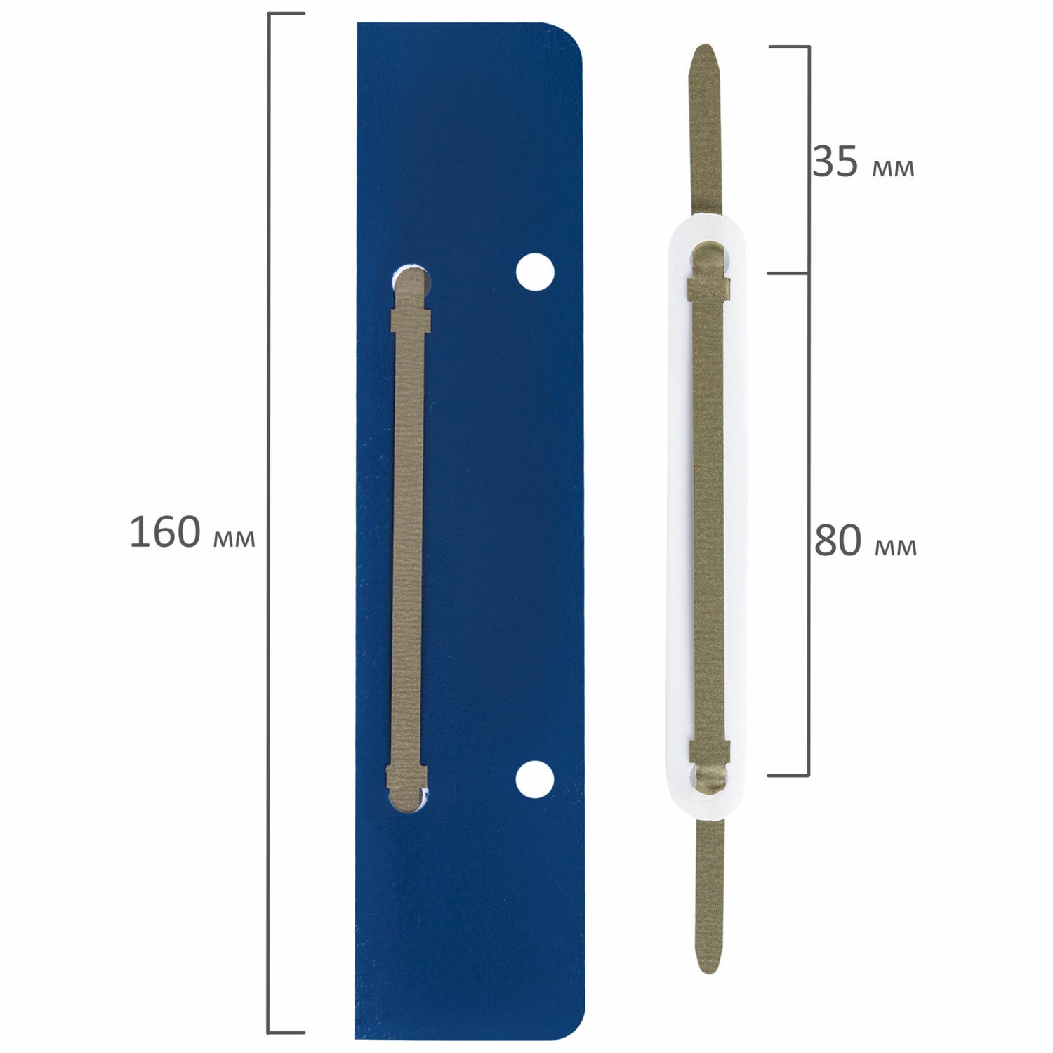 В комплект входит 50 штук. Механизм размером 160х36 мм состоит из металлопластика синего цвета. Длина ножек - 35 мм, а расстояние между отверстиями составляет 80 мм. Вмещает до 100 листов.