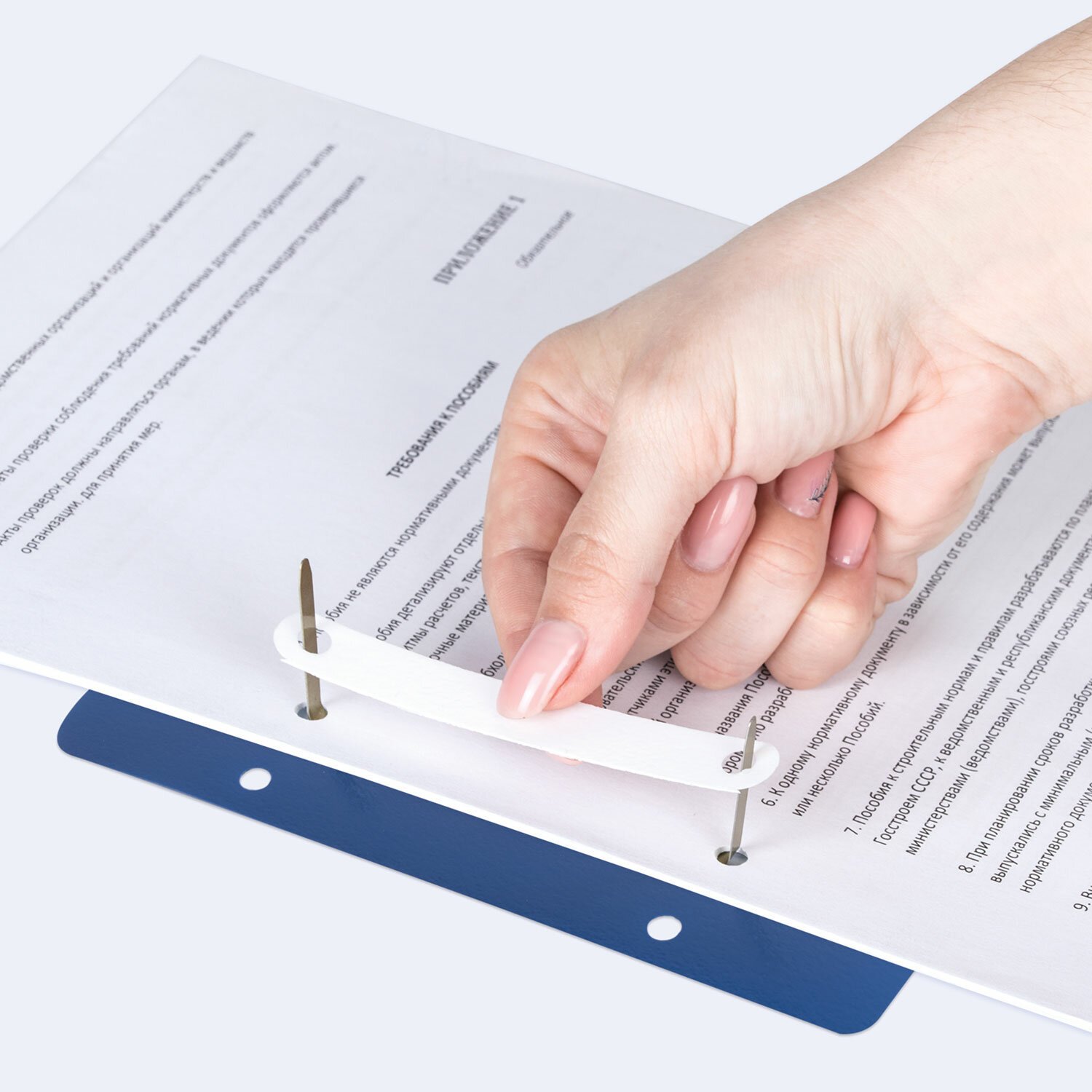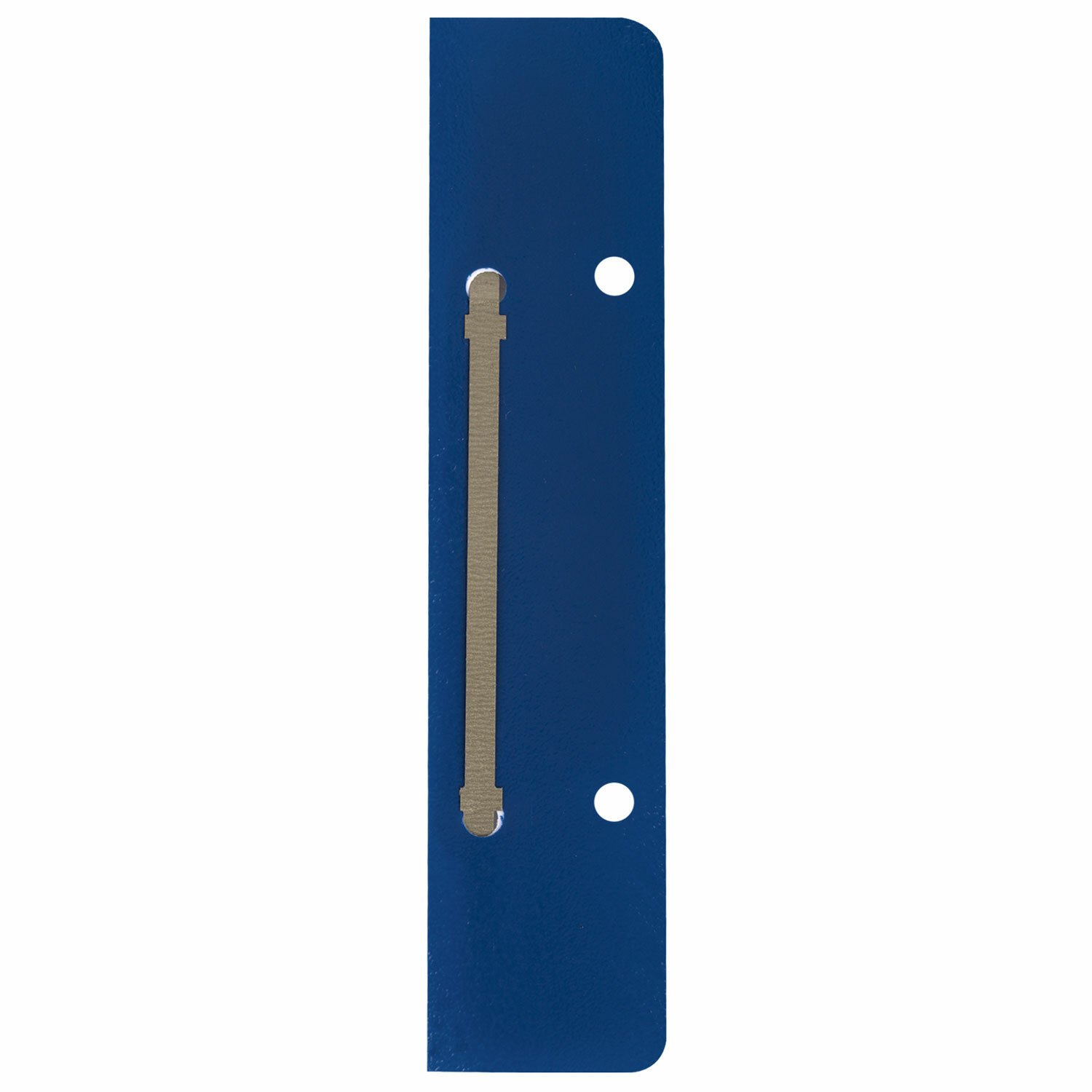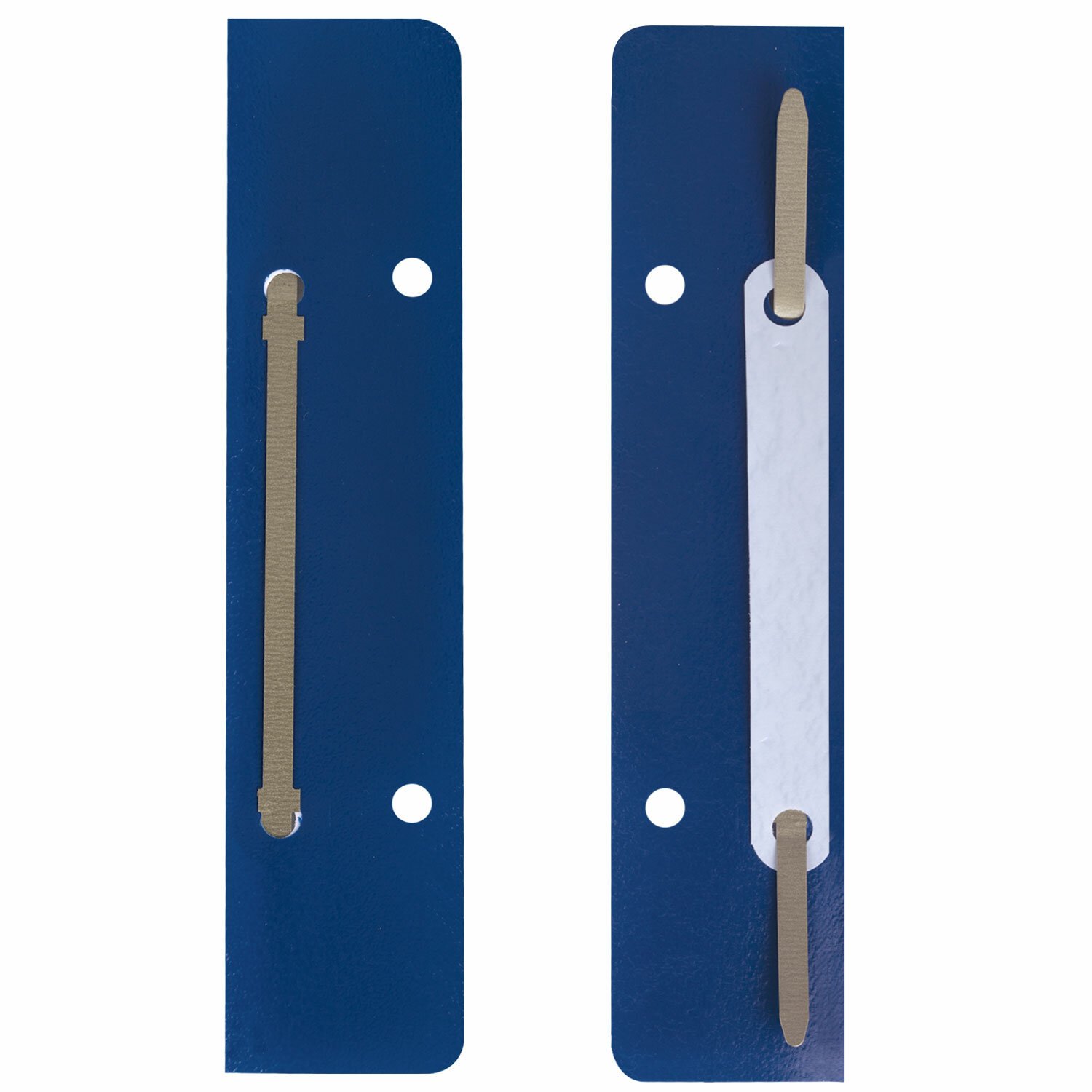 В комплект входит 50 штук. Механизм размером 160х36 мм состоит из металлопластика синего цвета. Длина ножек - 35 мм, а расстояние между отверстиями составляет 80 мм. Вмещает до 100 листов.