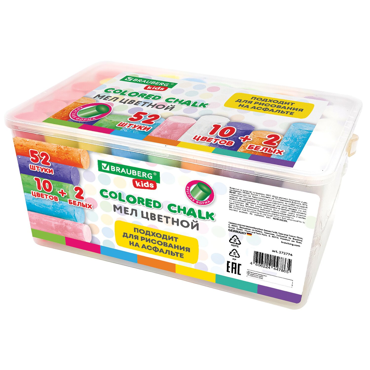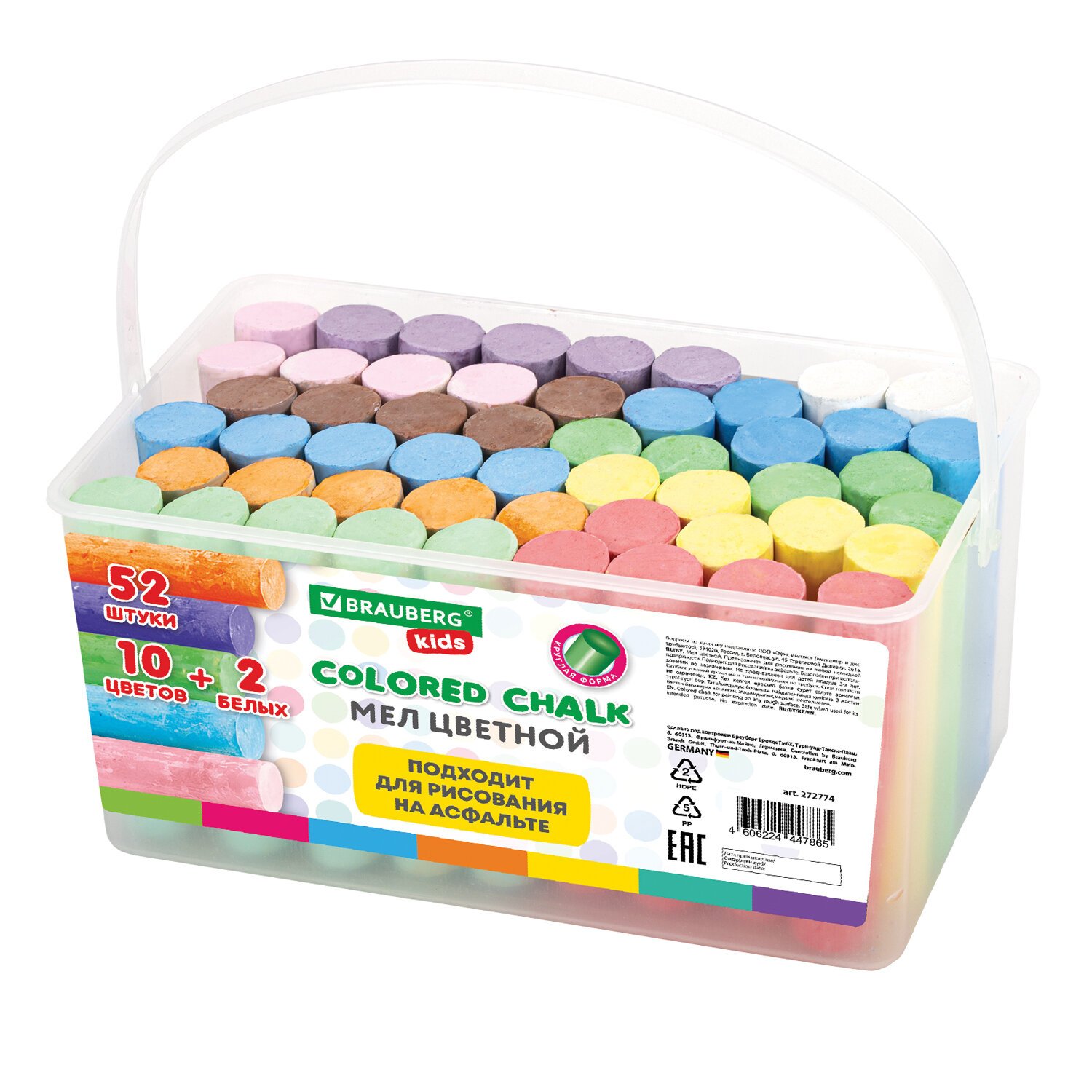 Мел в ведерке для рисования на асфальте 52 штуки, цветной круглый, BRAUBERG KIDS, 272774