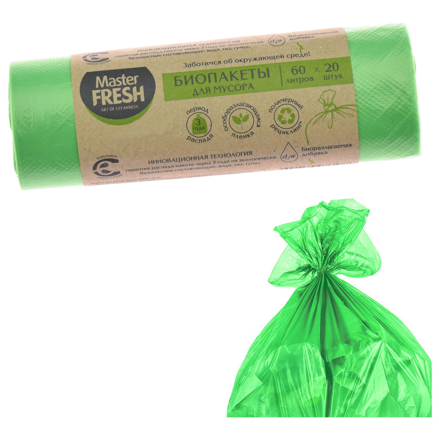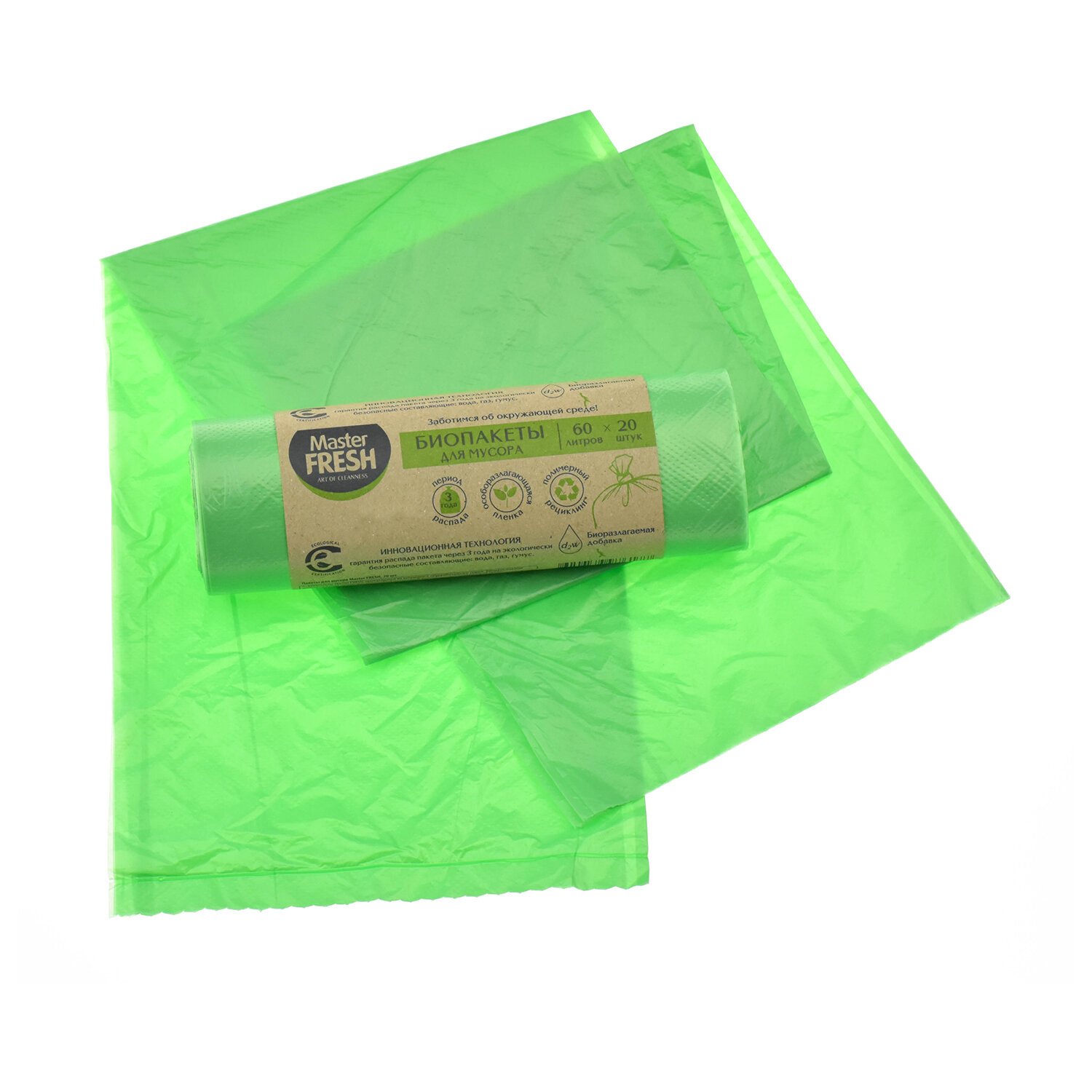 Мешки для мусора 60л, биоразлагаемые салатовые, 9 мкм, 20шт, Master FRESH, ШК6177