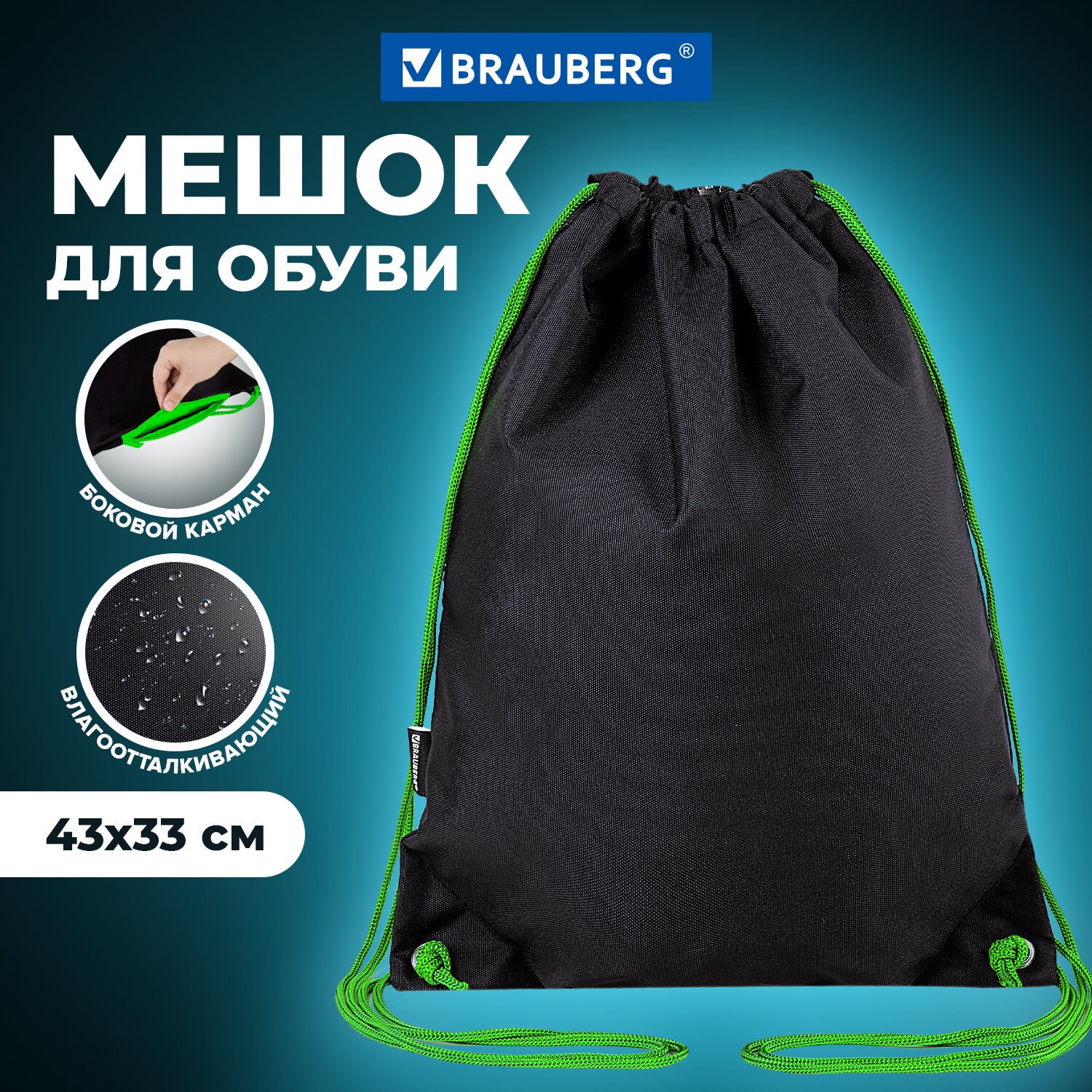 Мешок для обуви BRAUBERG NEON изготовлен из плотного полиэстера с водоотталкивающей пропиткой. Внутри мешка - износостойкая подкладка контрастного неонового цвета. Снаружи боковой карман для мелочей, где можно хранить ключи, пропуск и другие личные вещи ребенка.