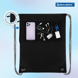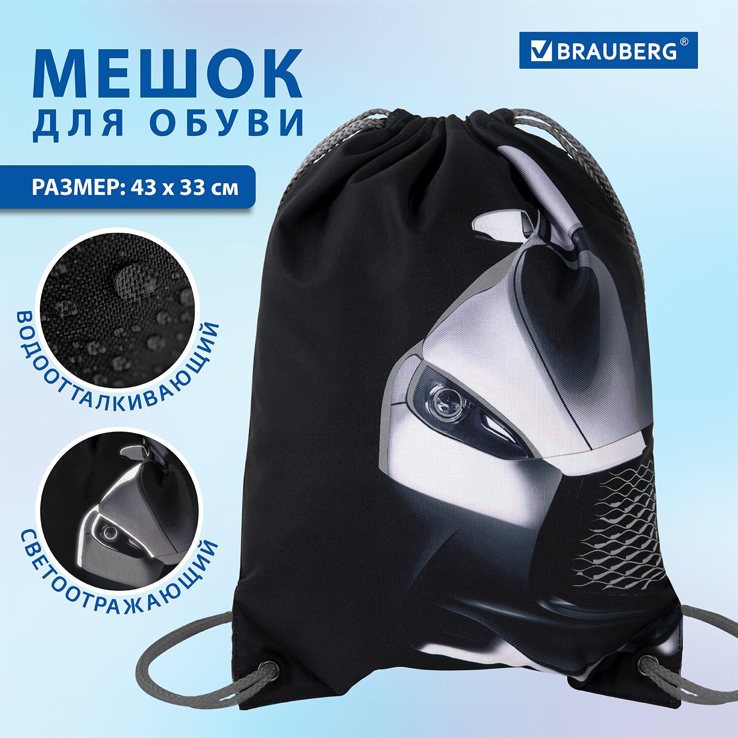Мешок для обуви BRAUBERG PREMIUM, карман, подкладка, светоотражайка, 43х33 см, "Black car", 271623
