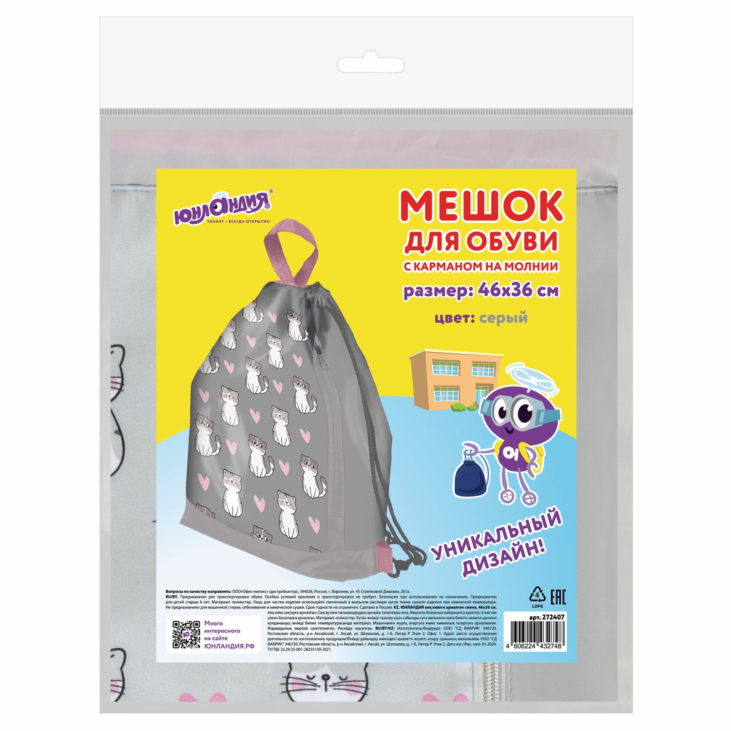 Мешок для обуви ЮНЛАНДИЯ с ручками, боковой карман на молнии, 46х36 см, "Kitties", 272407