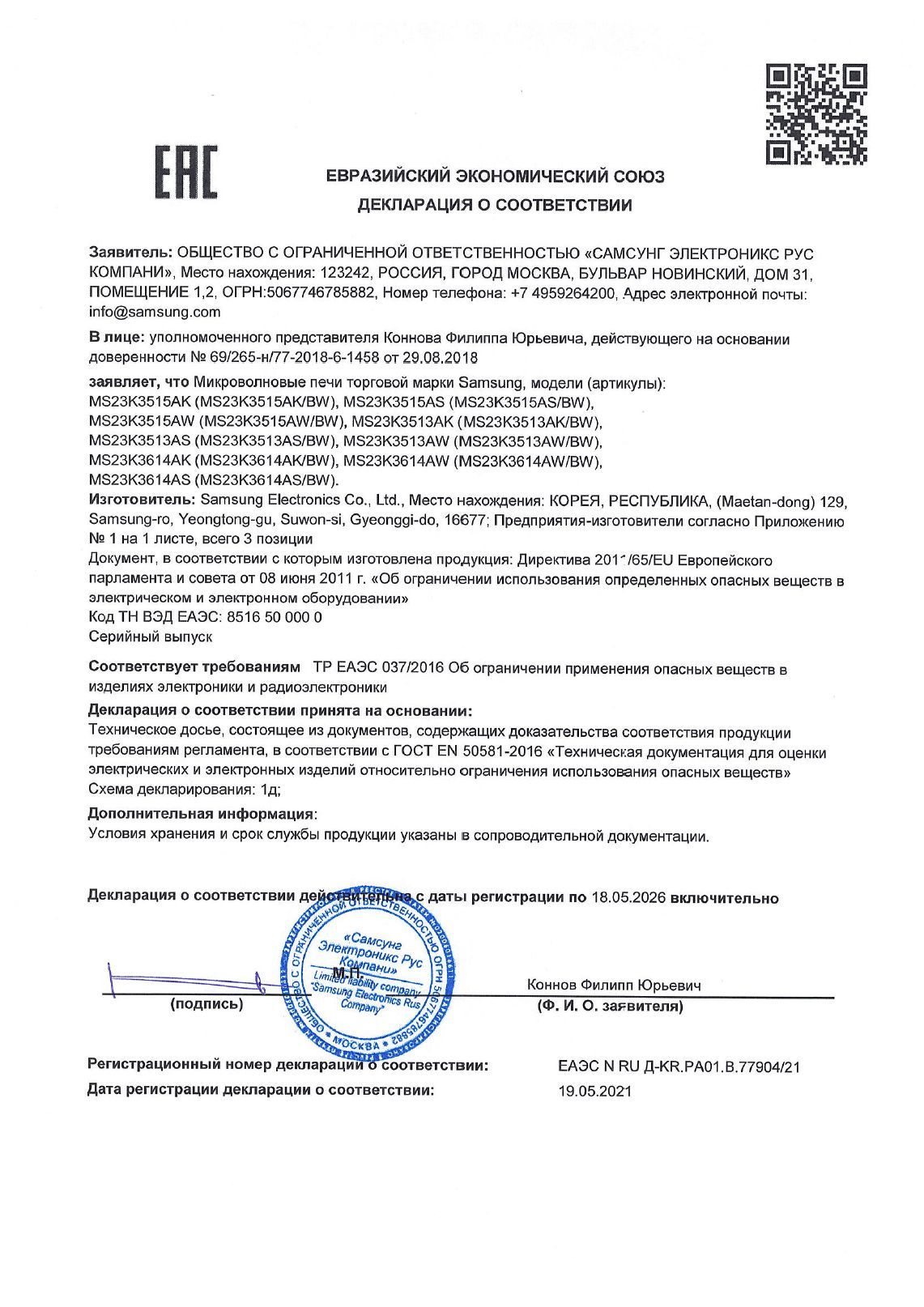 Микроволновая печь SAMSUNG MG23K3515AK/BW, объем 23 л, мощность 800 Вт, электронное управление