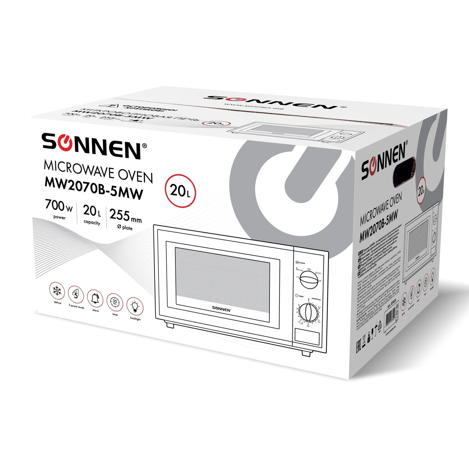 Микроволновая печь SONNEN MW2070B-5MW, 20 л, 700 Вт, таймер, механическое управление, белая, 454654