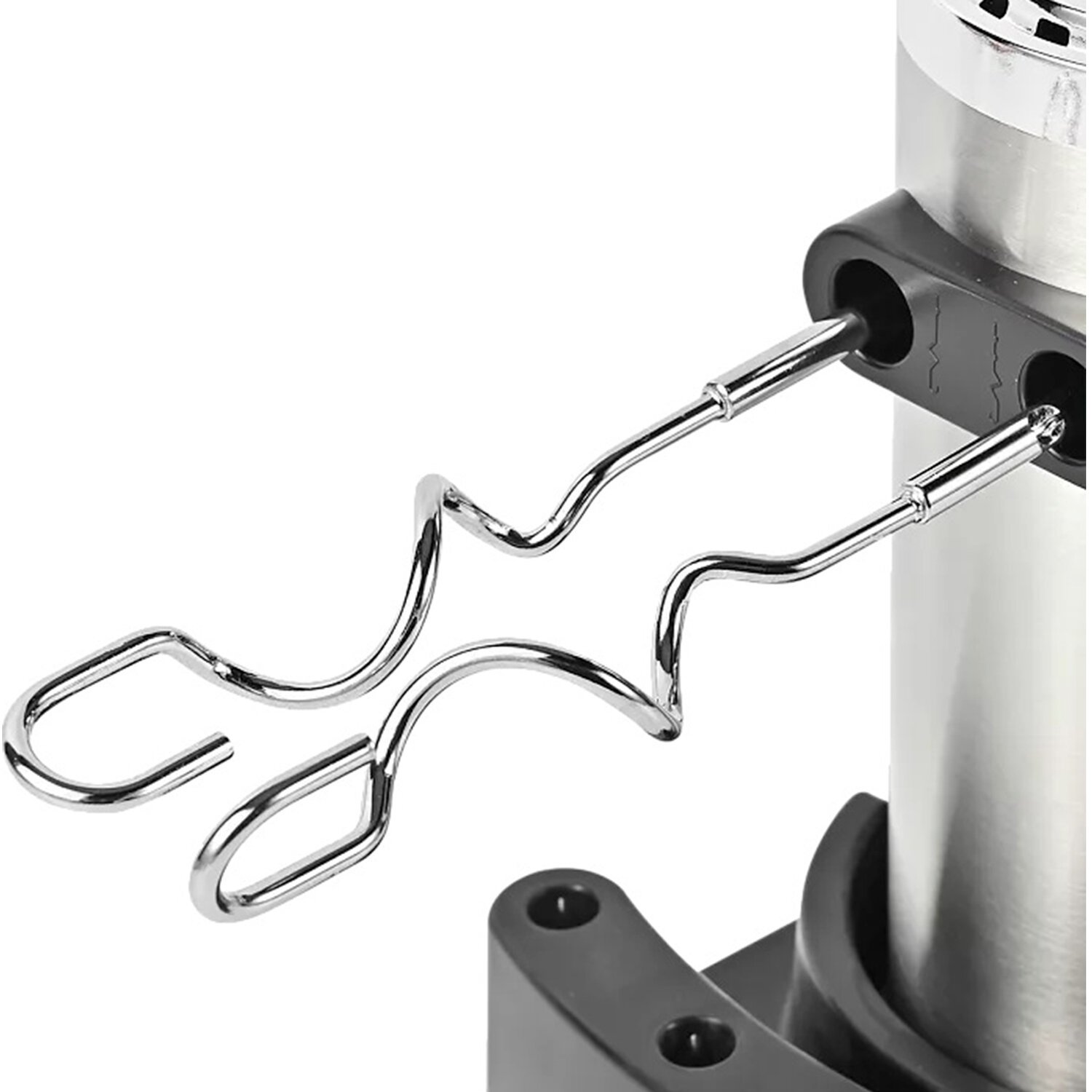 В комплекте предусмотрены 2 крюка для замешивания теста и 2 венчика для взбивания яиц и крема, а также смешивания жидкостей.