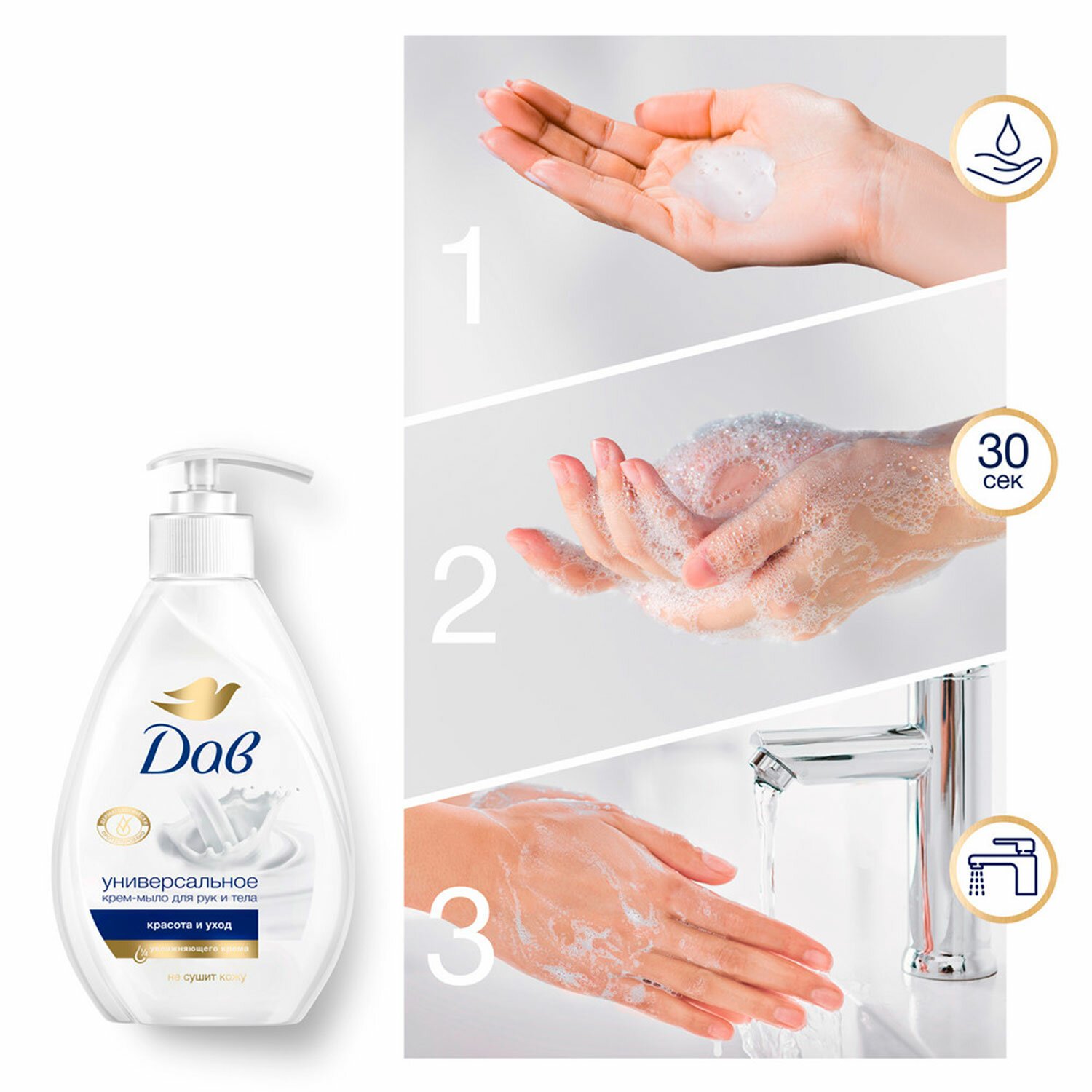 Нет ничего лучше, чем мягкая и увлажненная кожа, и она может быть именно такой каждый день благодаря правильно подобранным косметическим средствам. Благодаря жидкому крем-мылу Dove "Красота и уход" с эффективно очищающей формулой, на ¼ состоящей из увлажняющего крема, кожа становится более нежной, гладкой и красивой. Помогает коже сохранять естественный водный баланс, оставаться мягкой и гладкой. Используйте каждый день для ощущения комфорта.