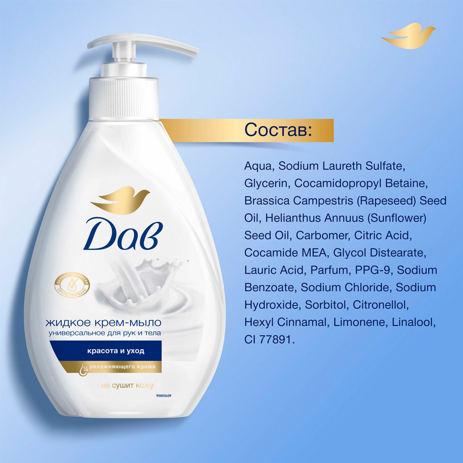 Пробуди свою красоту с крем-мылом от Dove. Выберите для себя жидкое крем-мыло Dove "Красота и уход", на ¼ состоящее из увлажняющего крема.