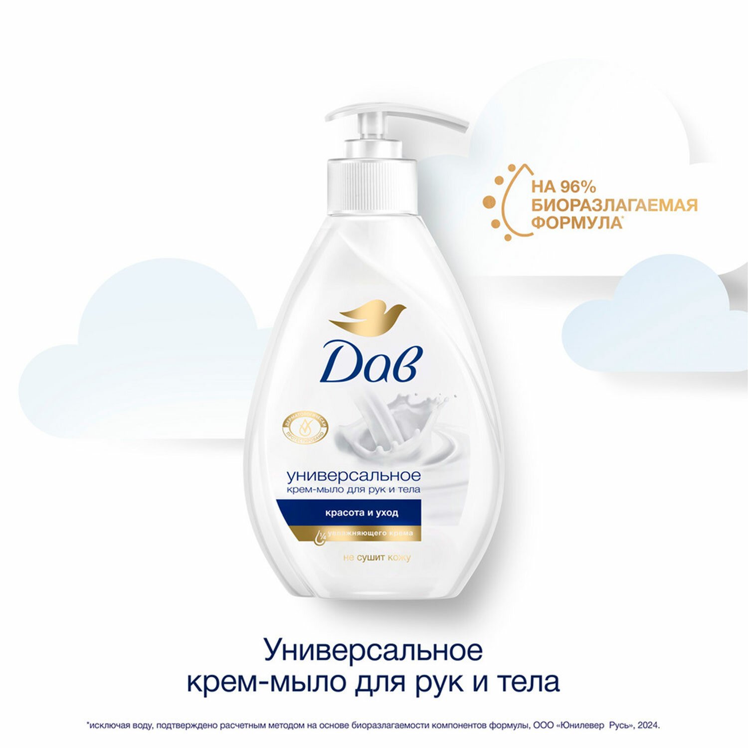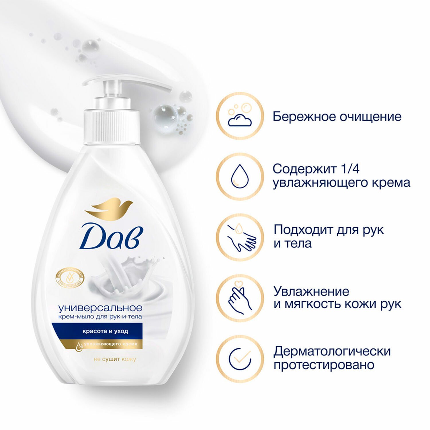 Жидкое крем-мыло Dove - это мягкое очищающее средство, которое сокращает вероятность появления раздражения или сухости кожи рук, поэтому оно является идеальным дополнением к косметическим средствам.