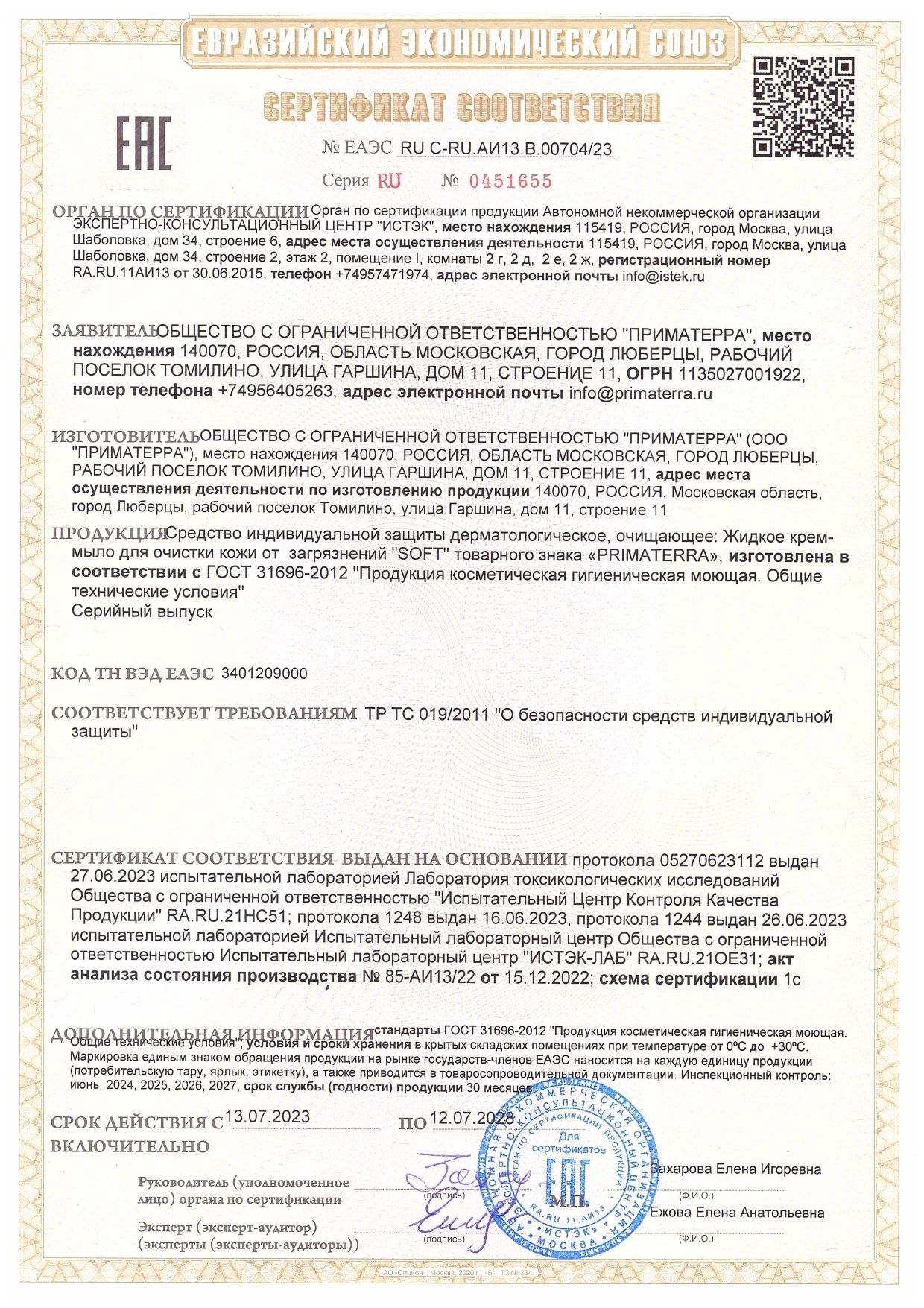Мыло-крем PRIMATERRA SOFT предназначено для мягкого очищения кожи любого типа от различных видов легких производственных и бытовых загрязнений.
