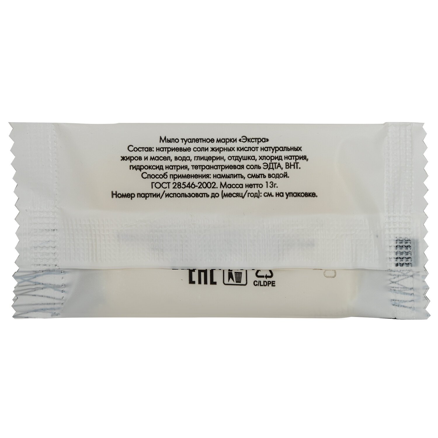 Мыло прямоугольной формы весом 13 г упаковано во флоупак.