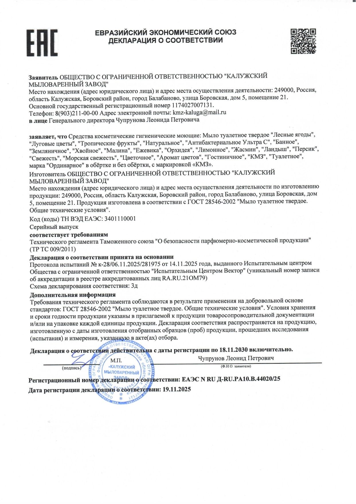 Глицерин, входящий в состав туалетного мыла, смягчает и увлажняет кожу. Мыло не содержит отдушек и красителей. Изготовлено из натуральных жиров и масел.