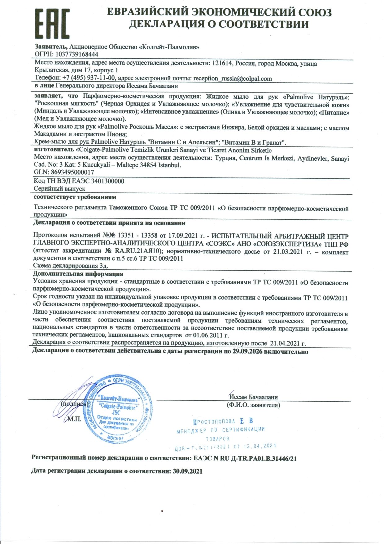 Экстракт оливы, входящий в состав жидкого мыла Palmolive, издавна известен своими полезными свойствами. Масло плодов оливкового дерева защищает кожу от вредного воздействия ультрафиолета, нормализует кислородный обмен и питание клеток кожи.