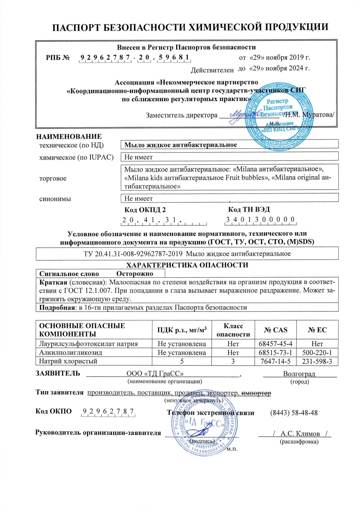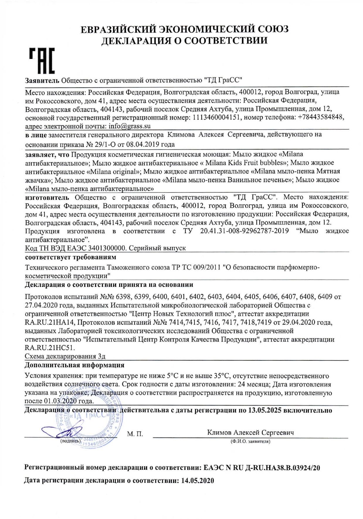 Жидкое мыло GRASS MILANA aнтибактериальное бережно очищает кожу, оставляя после мытья ощущение свежести и гладкости кожи. Содержит антисептический агент который убивает бактерии на коже и в дальнейшнем замедляет их рост.