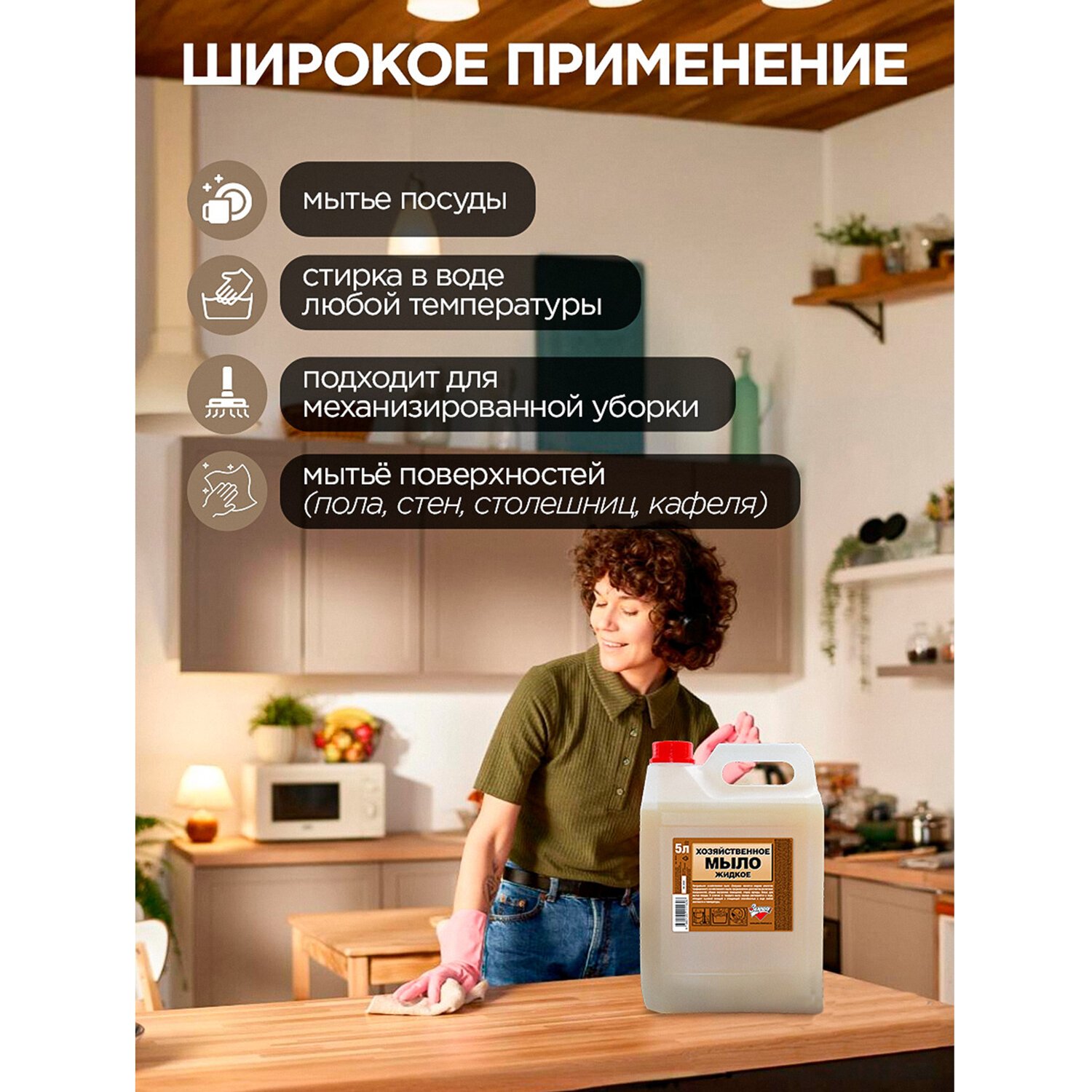 Является жидким аналогом традиционного хозяйственного мыла. Предназначено для очистки различных твердых поверхностей, ручной и механизированной уборки внутренних помещений (мойка стен, полов, сантехнического оборудования).