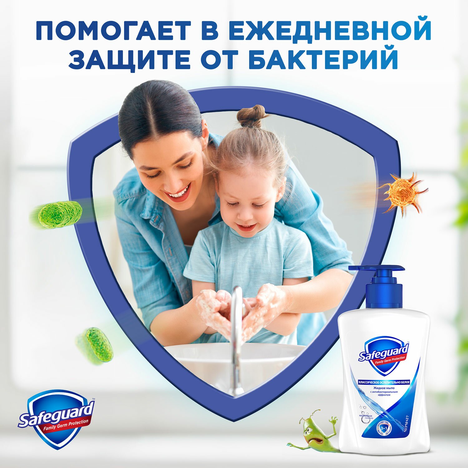 Попробуйте жидкое мыло SAFEGUARD "Классическое" с антибактериальным эффектом. Формула "Щит от микробов" с нежным ароматом смывает грязь и бактерии с рук и обеспечивает антибактериальную защиту от микробов каждый день. Наше жидкое мыло нежно для кожи, беспощадно к бактериям. По данным Всемирной организации здравоохранения, тщательное мытье рук – наиболее эффективный метод предотвращения распространения вирусов.