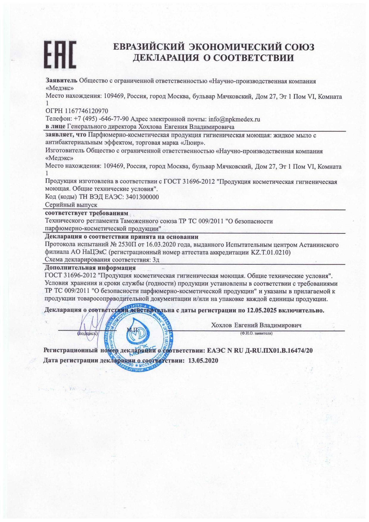 Жидкое мыло «Люир» представляет собой готовую к применению непрозрачную гелеобразную жидкость голубого цвета со слабым специфическим запахом.