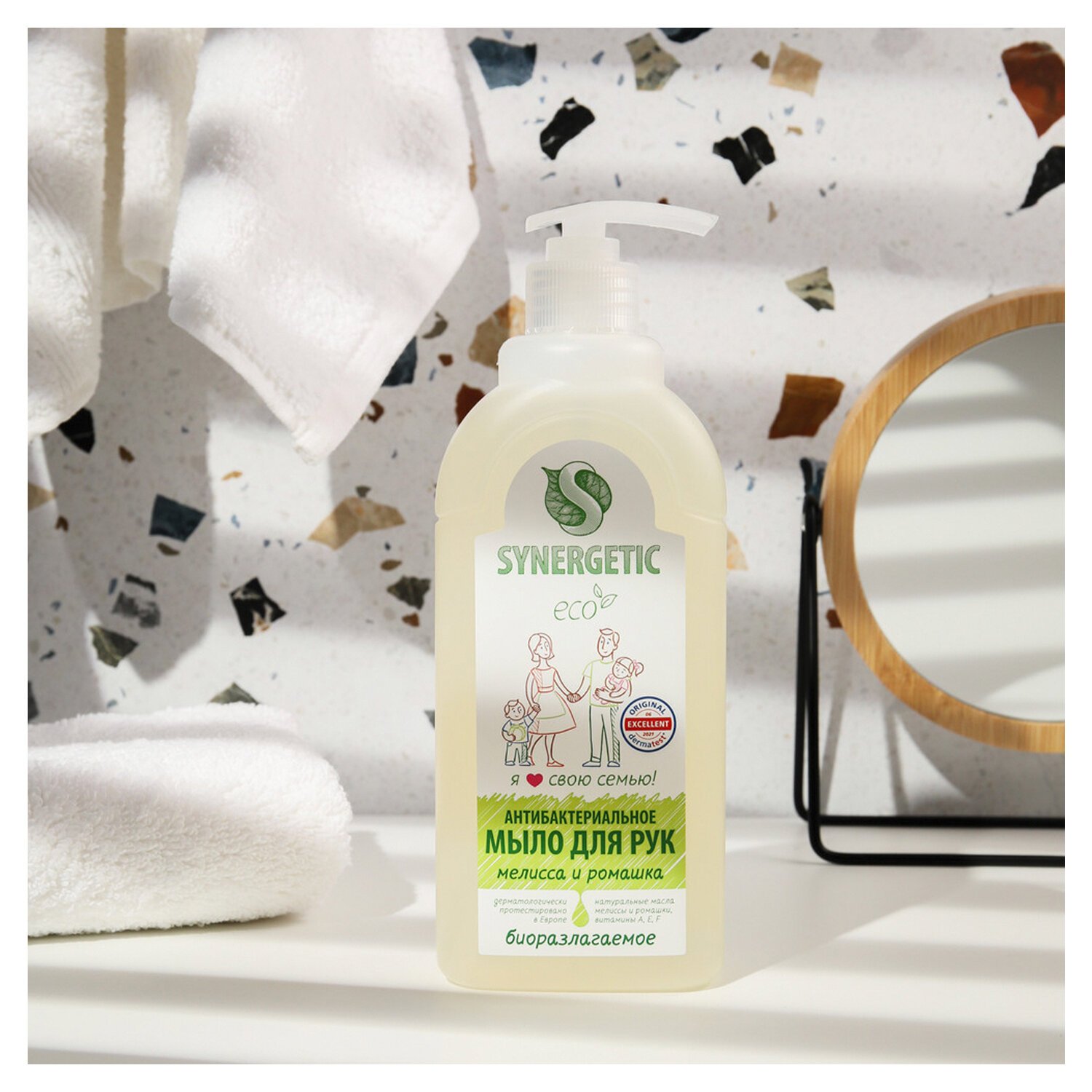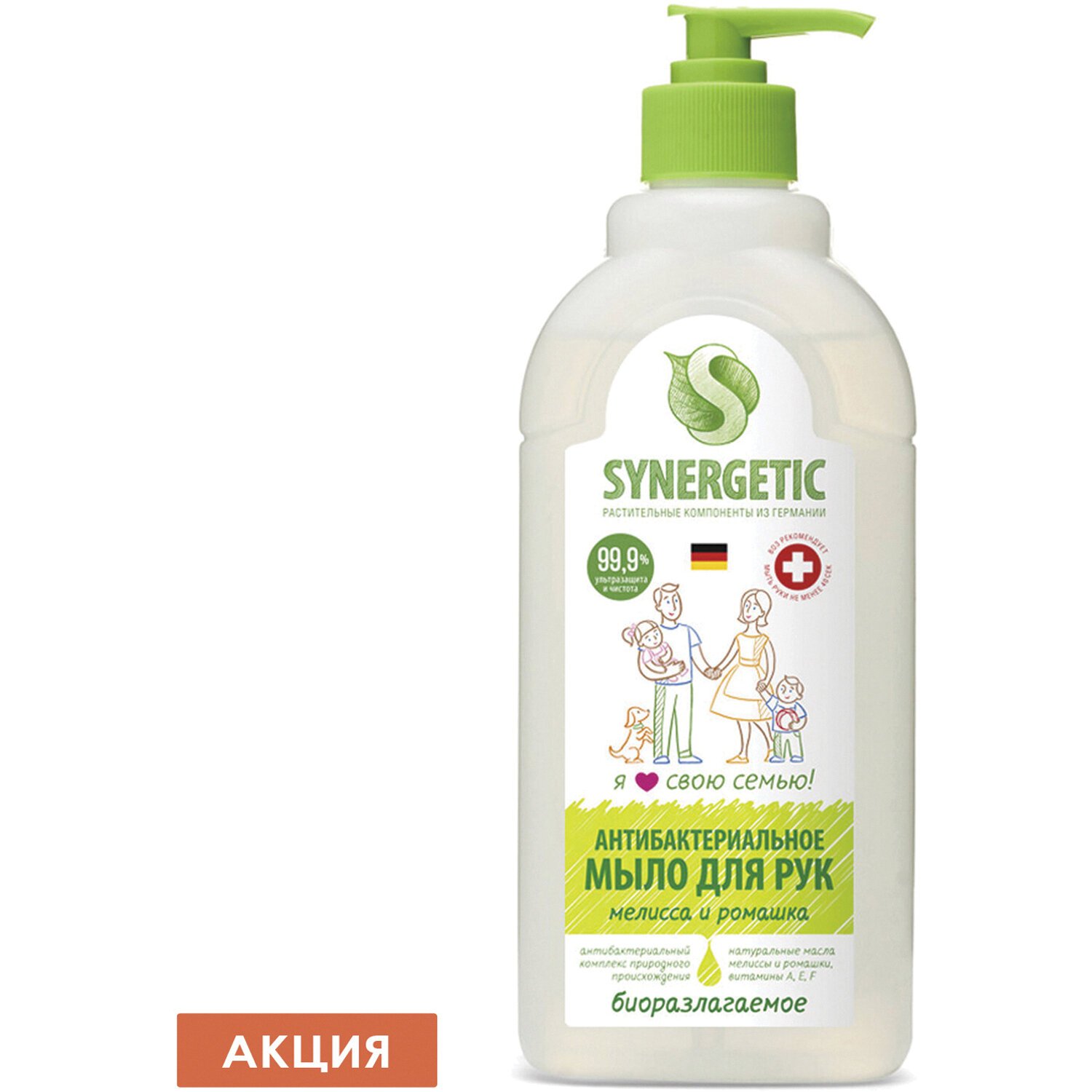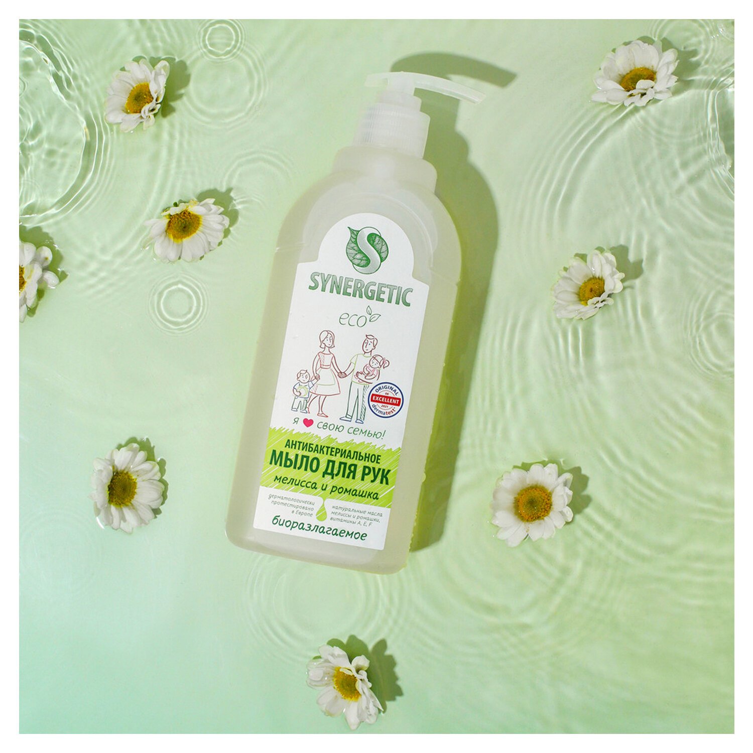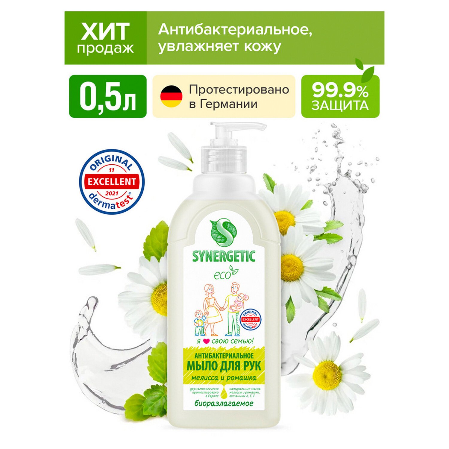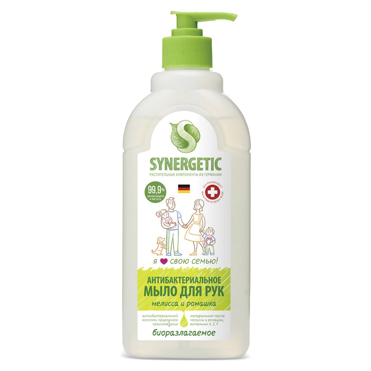 Антибактериальное увлажняющее жидкое мыло SYNERGETIC "Мелисса и ромашка" эффективно очищает кожу от любых загрязнений и запахов даже в холодной воде. Комбинация растительных К-тензидов, морской соли и натуральных эфирных масел мелиссы, ромашки, чайного дерева, эвкалипта и тимьяна обеспечивает длительный антибактериальный эффект с защитой от микроорганизмов на 99,9%. Растительный глицерин обеспечивает интенсивное увлажнение кожи. Комплекс витаминов A, E, F повышает сопротивляемость кожи неблагоприятному воздействию внешней среды. Мультифункциональный компонент натурального происхождения софоролипид мягко очищает и сохраняет естественный микробиом кожи. Гипоаллергенное средство подходит для чувствительной кожи. Мыло дерматологически протестировано независимым исследовательским институтом Dermatest® в Германии. Биоразлагаемые компоненты безопасны для природы и человека и не вредят микрофлоре септических установок.