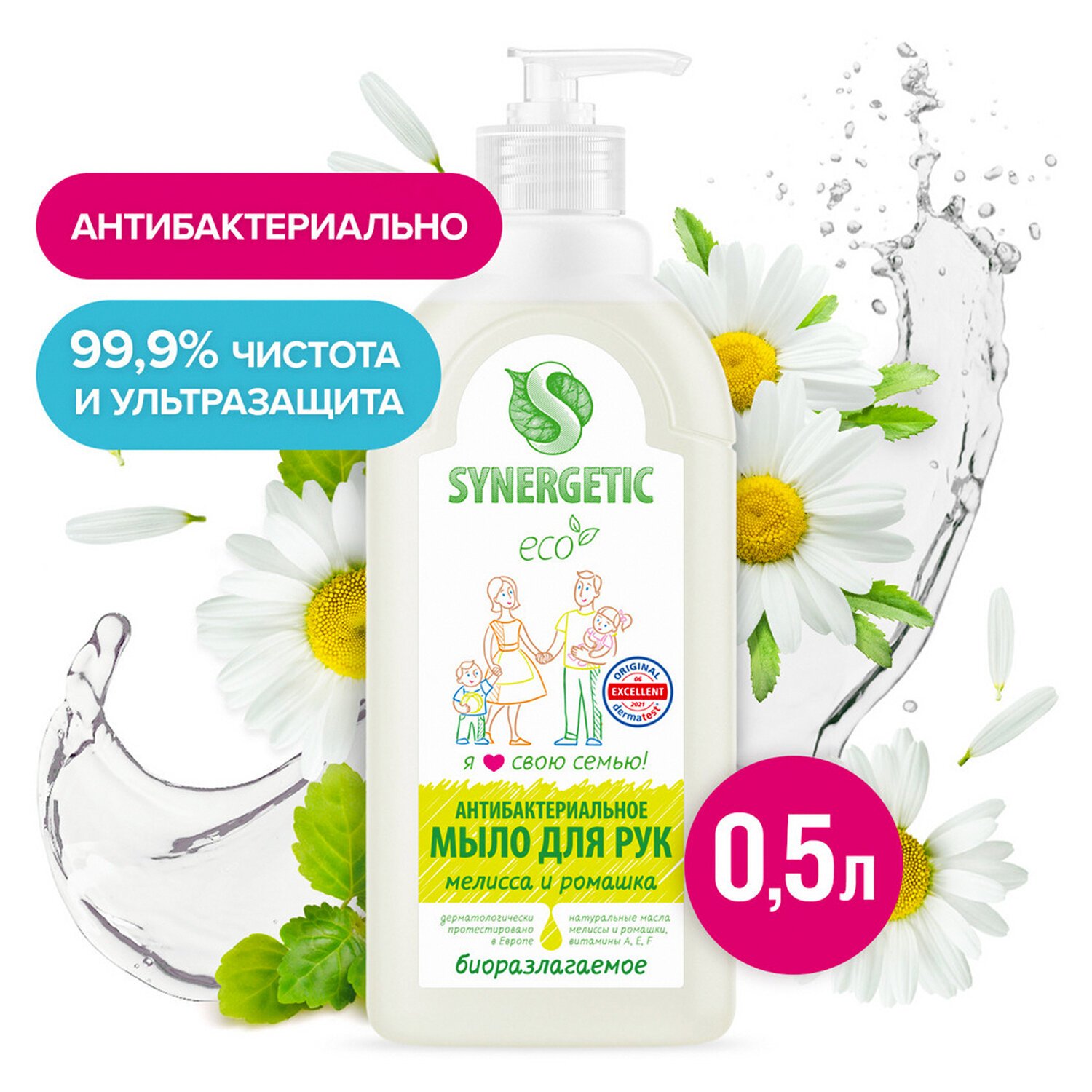 Мыло жидкое антибактериальное 500 мл SYNERGETIC "Мелисса и ромашка", 105061