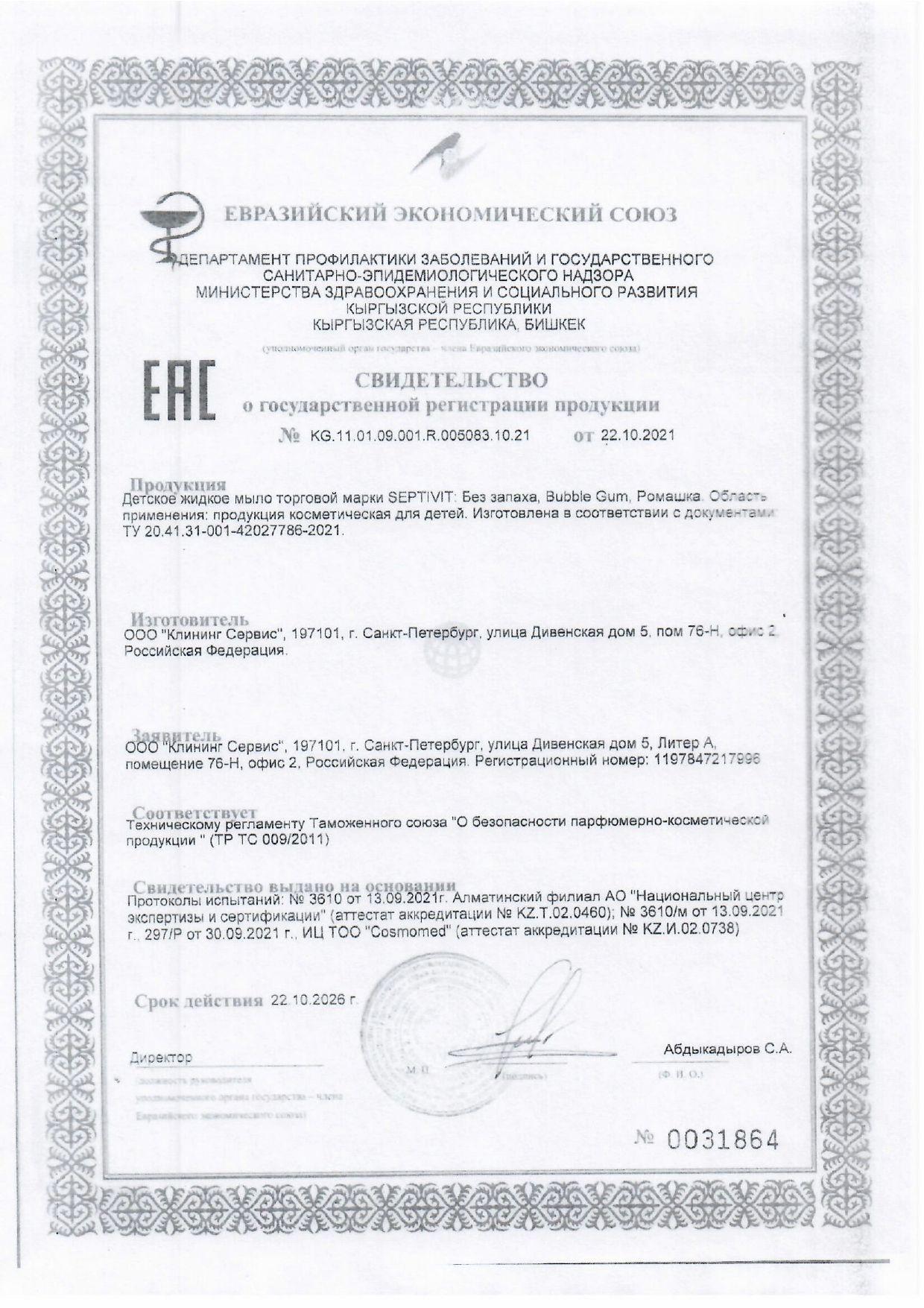 Мыло жидкое детское гипоаллергенное 1 л, SEPTIVIT "Bubble gum", биоразлагаемое, дозатор